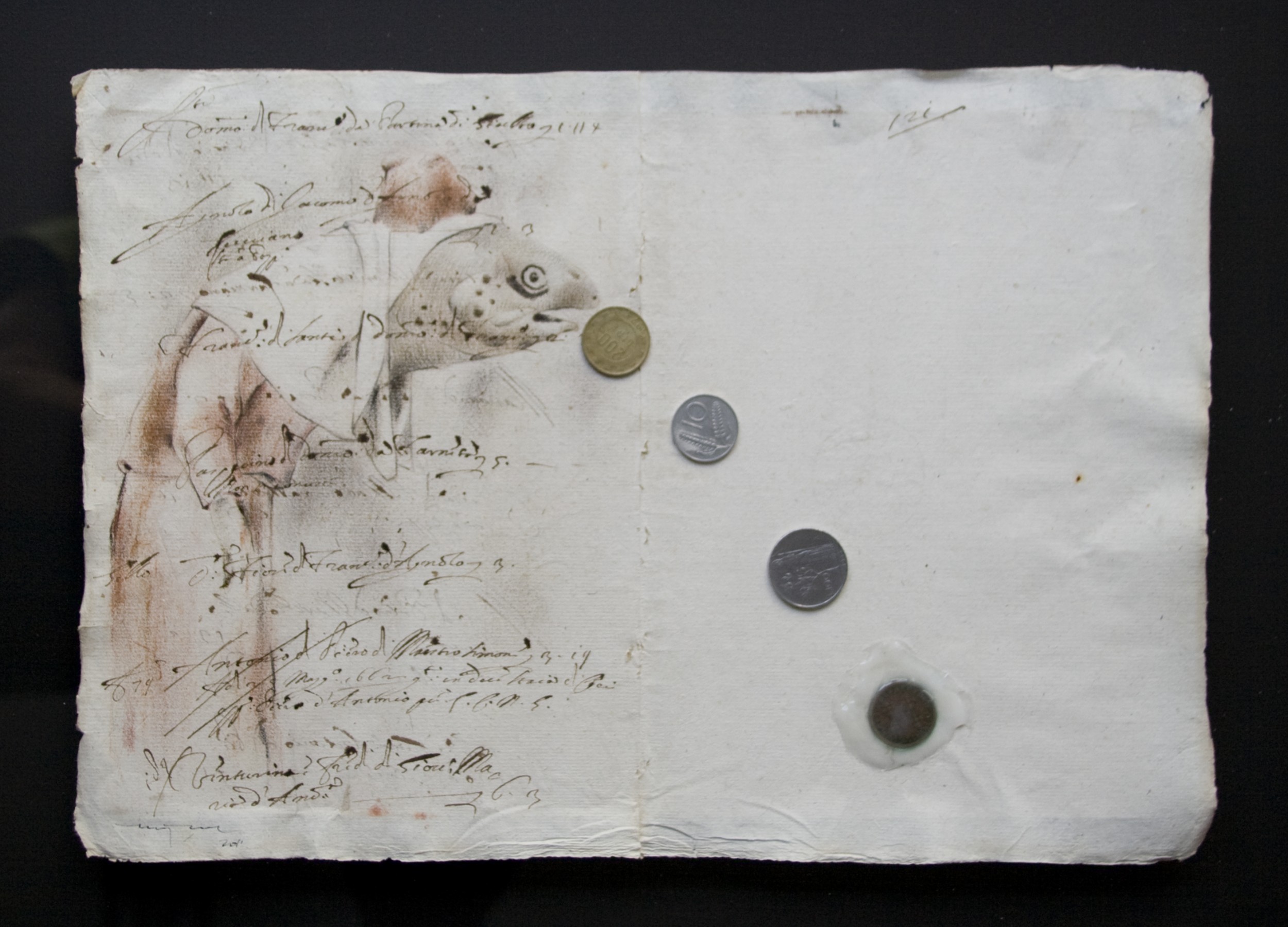 La fiaba ed il salmone Painting, Animal, Human figure, Sacred / Mythological, Pencil, 62x54cm Pencil animale uomo disegno drawing antico manoscritto +Drawing on Original Handwrite Paper (date 1600-1690) +Objects From a real story: the salmon pink made in laboratory Added 14 years ago 1 I Like I don't like 0 Comments 301 Visits Share Facebook Twitter Google + Has been liked by 1 Noga Harel Artist, Designer, Art lover - Jerusalem, Israel Comments 0 Say something You must login or Sign Up to write a comment Join