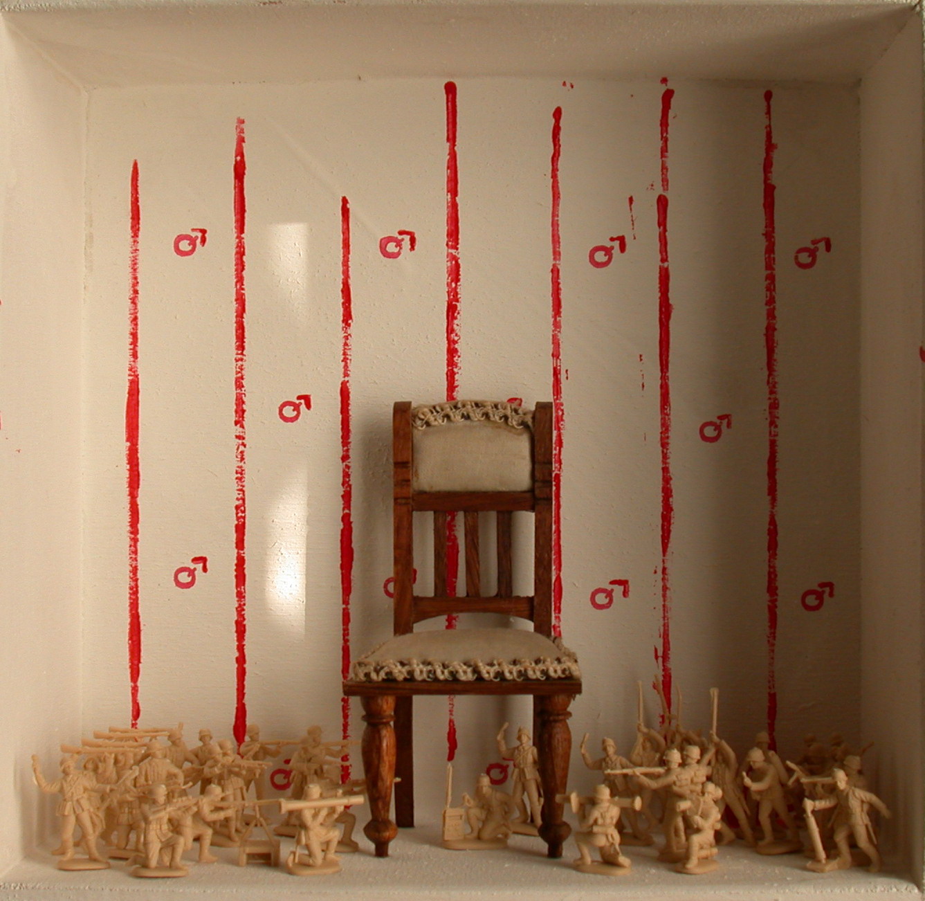 assemblage, tempera, Italeri®miniatures "German Infantry - World War II" 6033, dolls' house wooden chair, in wooden frame 20x21x8,5 cm., 2011