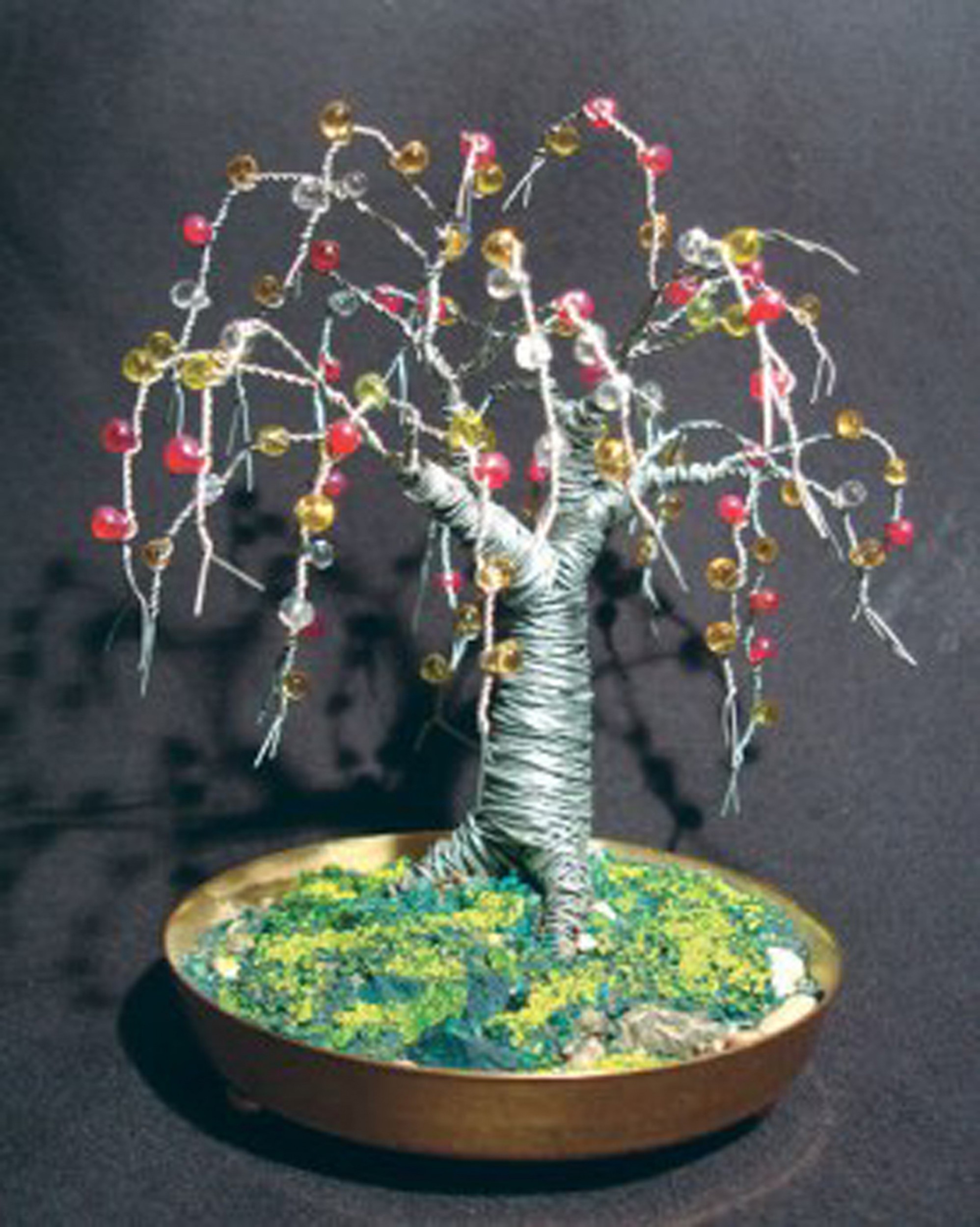 5" x 5" x 4" Made of 24 and 26 gauge galvanized steel wire with red, yellow green and white fringe beads woven into the branches. Bonded into a round brass base using sea sand and small pebbles. The sea sand is painted yellow and green to look like moss covered earth.