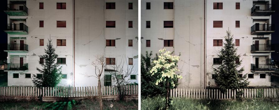 Nowadays the suburb is a series of uninhabited buildings, a desolate place. Some houses resisted, others fell down. Most part is damaged showing cracks and structural breakdowns. More than two years passed but time seems to be stopped and the nature got the upper hand. The trees and foliage hide part of the buildings. Few days after the earthquake a woman among the rubble said: “Life can’t go on if the rubble remain; the rubble have to be removed… this could be the sign that things shall work again.” This never happened. The territory is still devastated and the identity of local people is strongly hit.