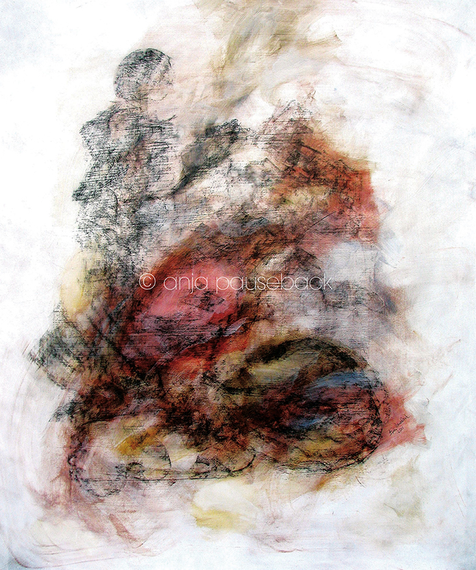 Imagine how old Romans lived and how they influenced the progress of the world: wars for more than fourteen centuries, fires, demolitions and new beginnings. This painting unites all these facets of history. History lives in Rome and under Rome. It flows from ancient times to our times. Cruelty, bloodshed and fire are also part of this city. Like an angel, a woman spreads her protective hands over the remains of an inferno and she seems to remove a few pieces of the smouldering wood.
