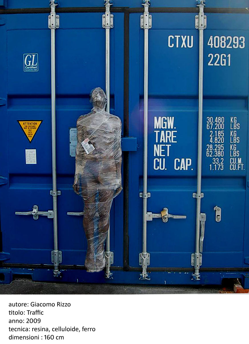 The sculptural installation work, is the illegal immigration issue, there is a helpless figure wrapped packaging for shipping in a large container.