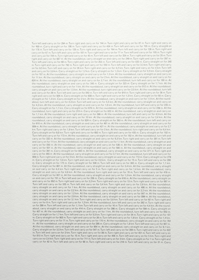 Hugal’s fine print, as blue as the blue expanse of Newman’s painting, compresses an entire array of gestures and positions that articulate, in their disparity and discontinuities, a vexed relation to tradition. At another level, Hugal pairs the preeminent tool of today’s knowledge transmission, Google, and the difficulty of an initiation into the terms, procedures and rewards of abstract art. Via Google, one could either obtain a low-resolution reproduction of a Newman painting, or traffic directions as to how to go and see one. These regimes of experience overlap in the work, which offers abstracted directions and pure calculations: a set of movements to be performed in order to reach the radiant immediacy of the painting, the choreography linking an abstract body, an abstract road and a painting that belongs to another place in time. text written by Mihnea Mircan for A Slowdown at the Museum Extra City 2011 - copyright Mihnea Mircan 2011