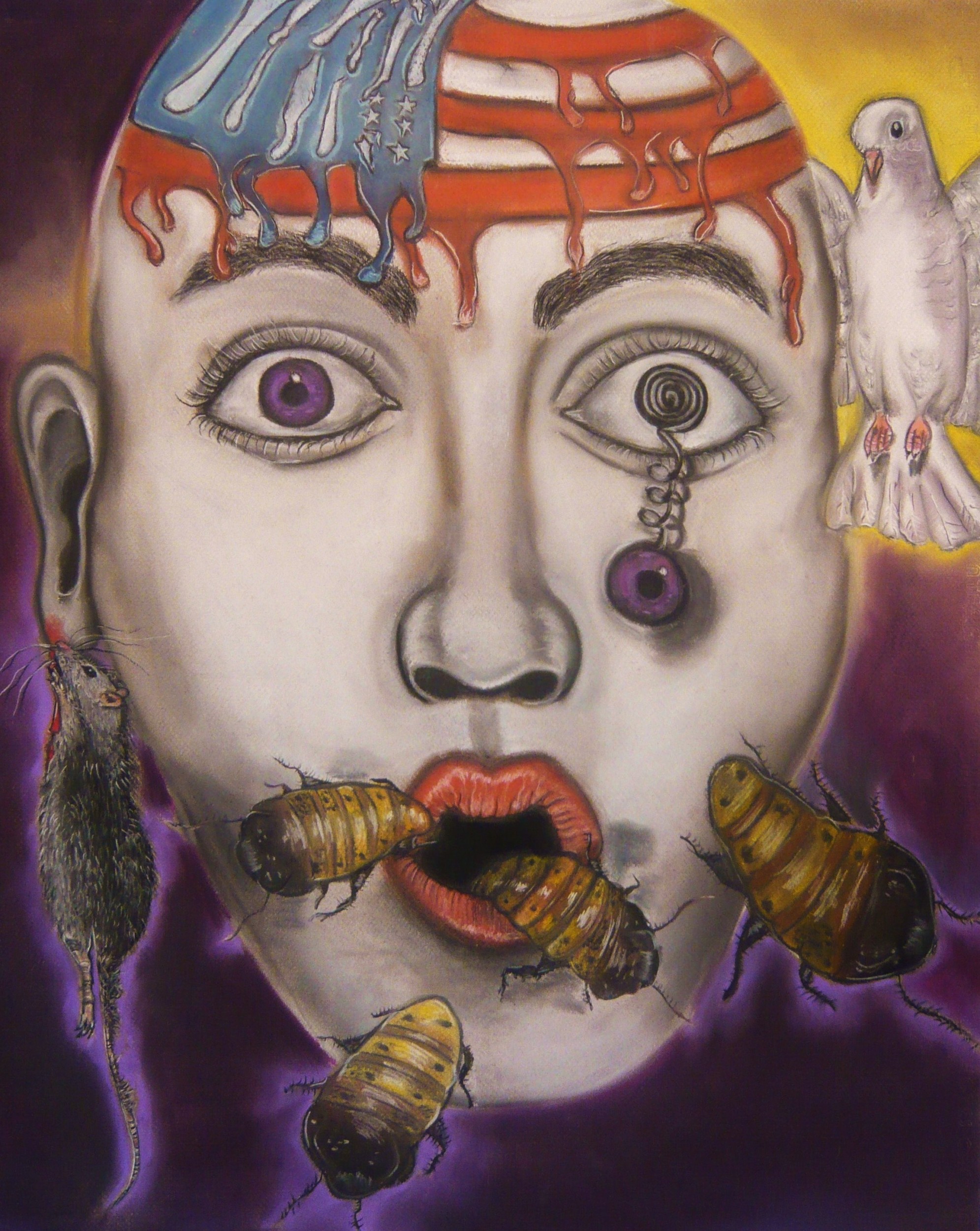 This work represents the moral and political corruption that has consumed America. Although America pretends to be perfect, a worldwide leader on the surface, inside and out there is evidence of horror and decay. However, there is still hope in the form of a dove.