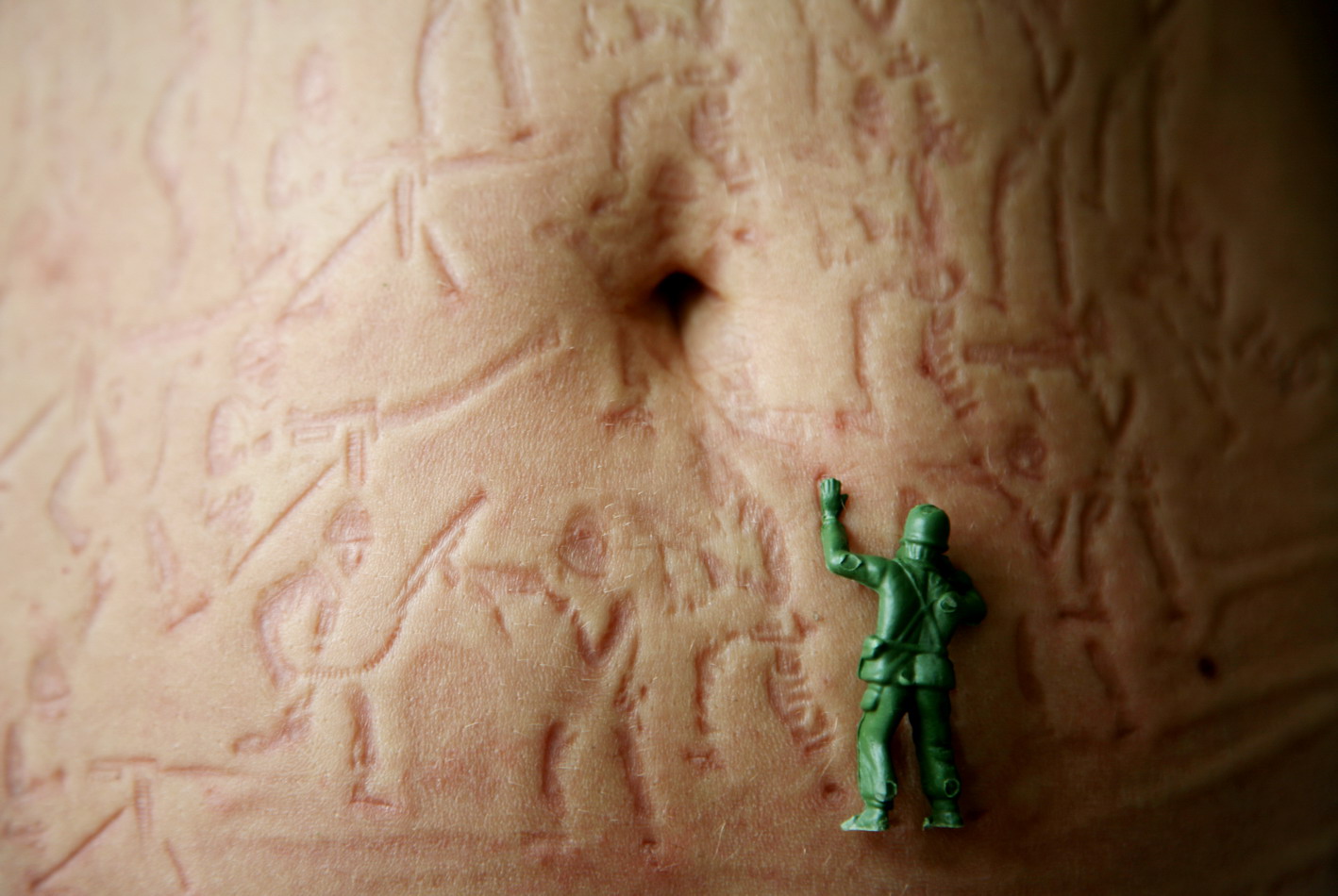 A platoon of small soldier –figures are doing a murky, purposeless battle. After all has been done what remains are the morbid traumatic consequences of their actions. In the work quite often I use this masochistic sarcasm, and my body gets transformed into a plastic material, which I use to model the ideas. However what’s important here is not a physical action, but rather the aesthetic and beauty of the gesture which used to parody nothingness of my green plastic protagonists. The point that’s being made is the final beautifications with an exquisite and fine effect.