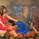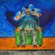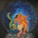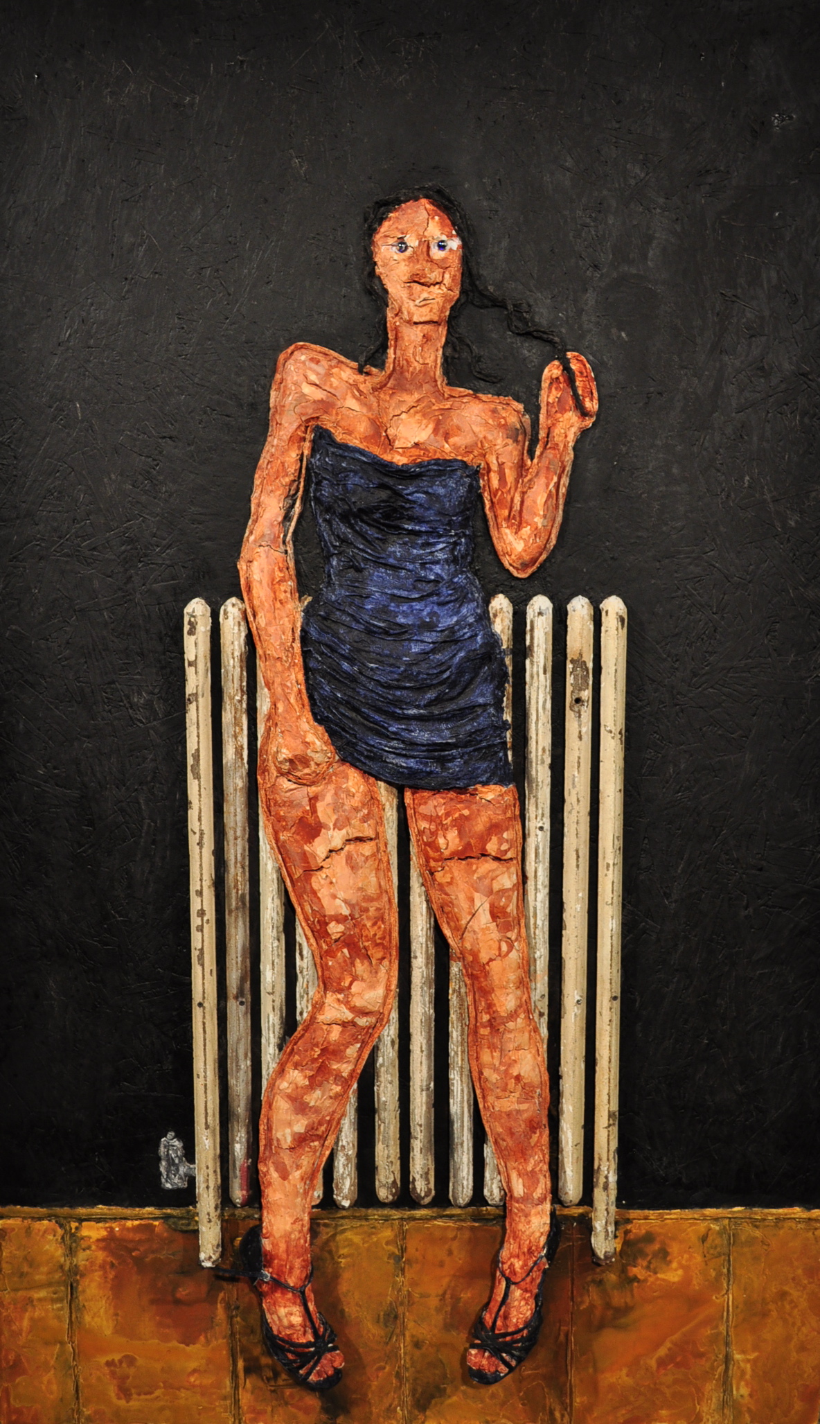 Was initially inspired by an image of the actress frieda pinto but then eventually morphed to represent a woman in my life. She was from albania and lived an extremely rough life, much like my art shes has had to endure the turmoil of decisions made . She was sweet and tough, the cracks in the joint compound were not premeditated. I purchased an antique cast iron radiator cut off 1inch off the face and attached it to my panel along with actual shoes that i sculpted her feet to fit in, and put marbles in place of her eyes, no paint brush poured acrylic mixed with water from water bottles