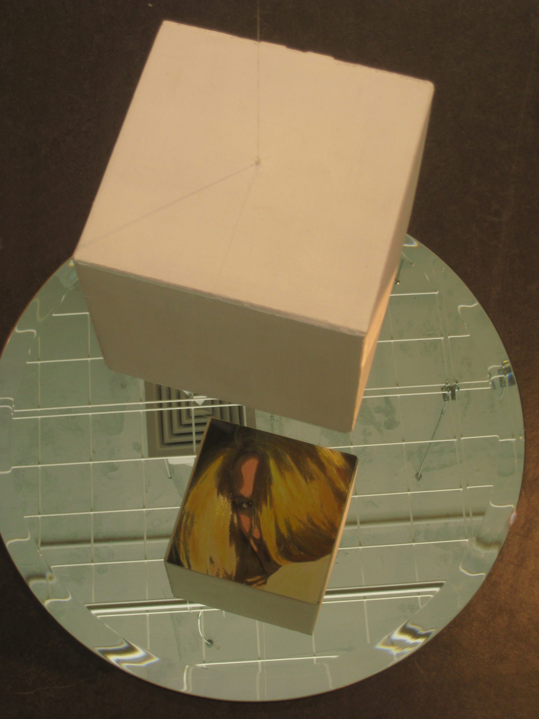Title: Do not stop at the appearance. A white cube is hanging from the ceiling. Below there is a morror which reflects, if you watch from the right side, a woman's face, hidden by her hair, which is painted on the lower part of the cube