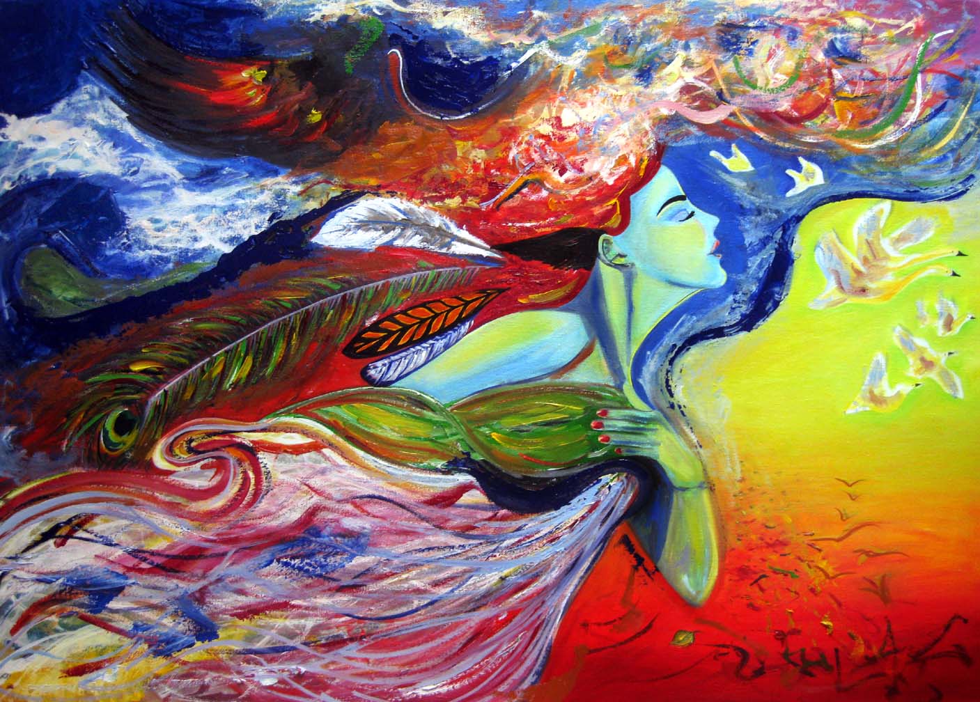 The original painting is about a goddess and the title of it is "The Spirit of Flight".