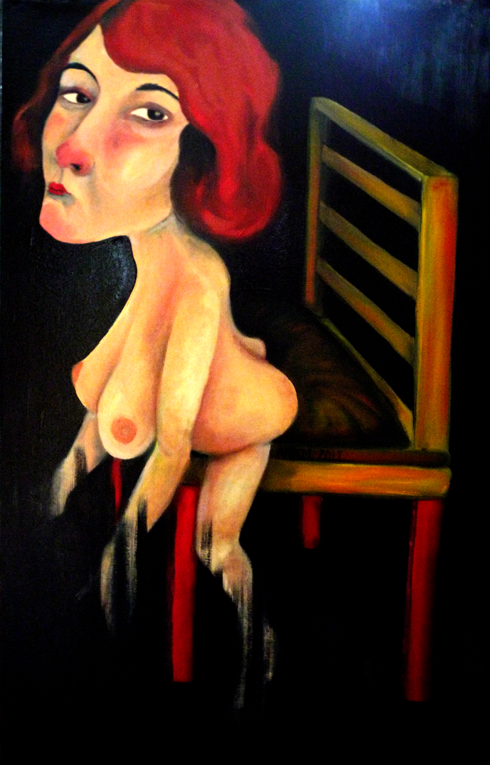The painting represents through a female body, the surrender of all mental and physical problems that life reveals to us. The woman who seems almost falling off the chair is for the artist the time to return to oneself, the moment of pause and reflection. The dark background avoids to divert attention from that single movement towards a center that is beyond the manifestation. In surrender the woman begins to fade taking the color of the background. The ocher color of the chair is almost gold symbol of the success, overturning the common conception that sees the act of surrender as a defeat. In the moment of surrender the answer comes. The secret is the acceptance of the manifestation of life.