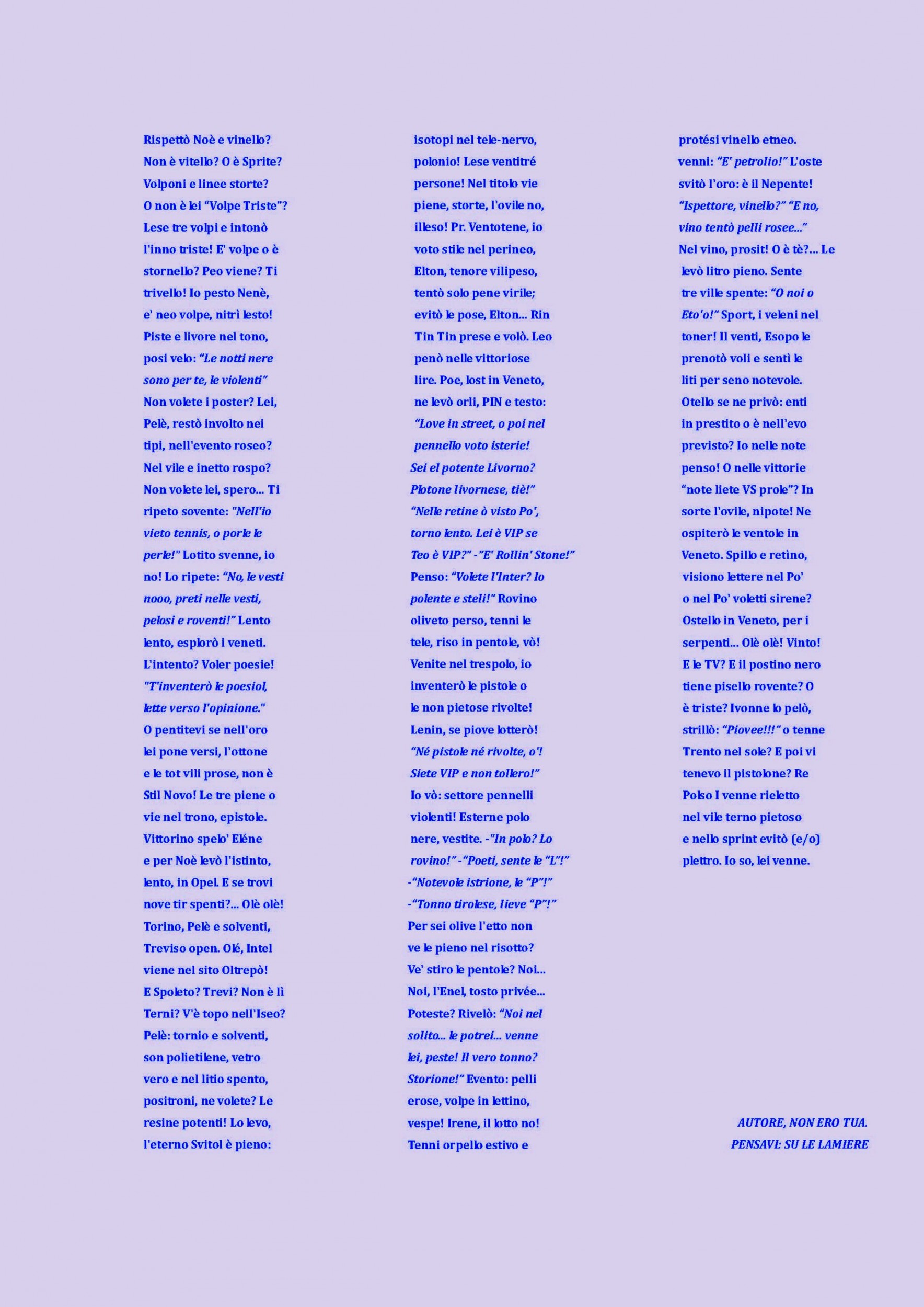 POEMA - VIOLETTO NEL PENSIERO-Elsa Lumière & Cybermotors Installation, Symbol / Letter, 11x11cm Added 12 years ago 0 I Like I don't like 0 Comments 103 Visits Share Facebook Twitter Google + There are no likes Comments 0 Say something You must login or Sign Up to write a comment Join