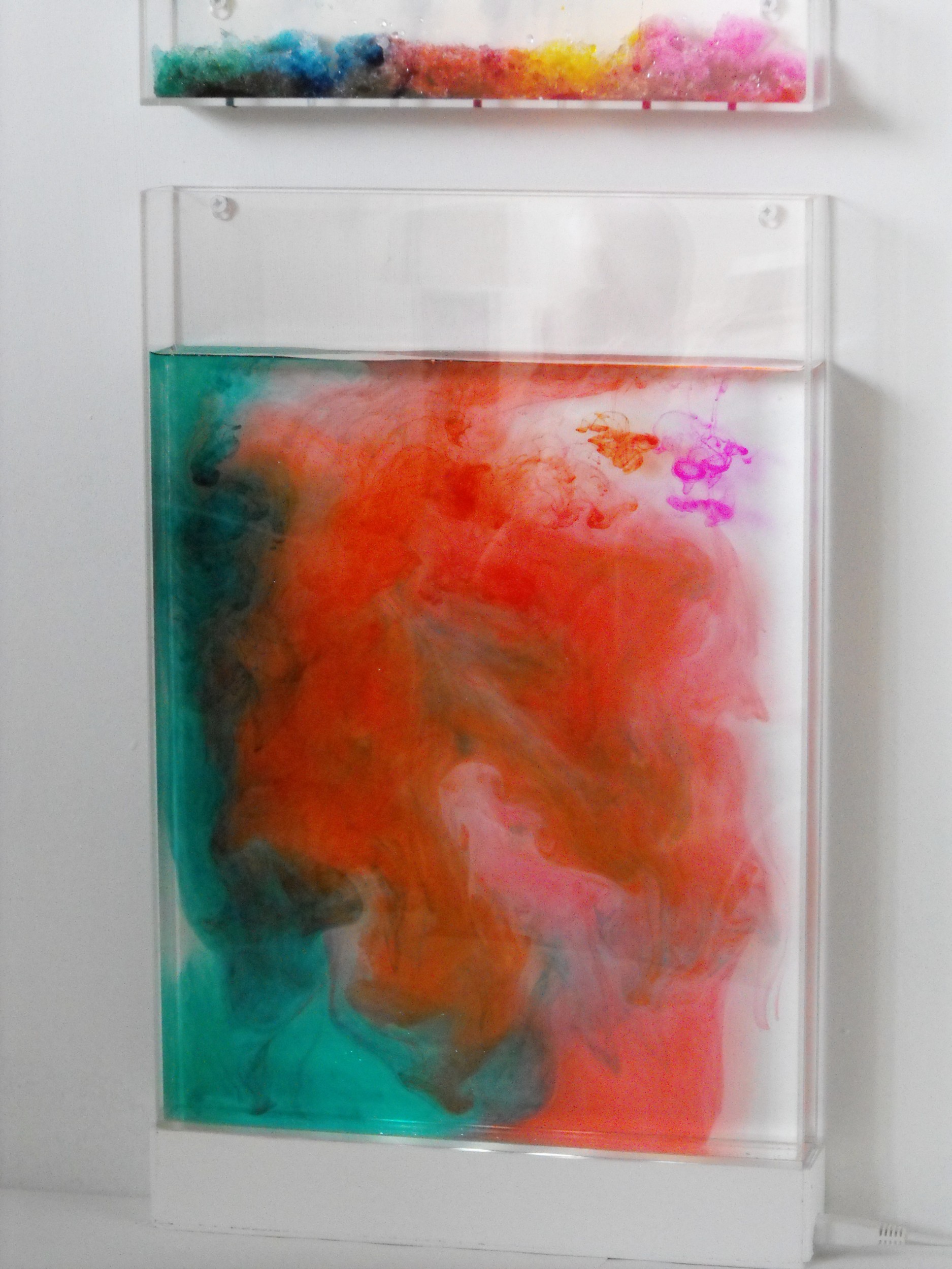 An installation piece about my memory, which uses snow and ink. The Ink infused snow melts and releases drips of colour into the water tank below. The resulting mixture of swirling patterns is completely random and different with every run.