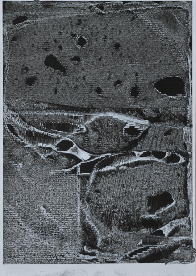 Using my hand and some other tools, with the addition of a little secret or two, I have managed to create a new world, abstract at first sight but bristling with references to figurative or formal features: green landscapes, seabeds, nascent stars, lunar terrains, hidden caves, rock walls, frozen rivers and lakes, enchanted forests, as well as sidereal views of incalculable depth – black holes which sometimes take on colour, asteroid fragments wandering in space, formal weaves which seem to offer no way out, and a great deal more... lastly, abstraction pure and simple.
