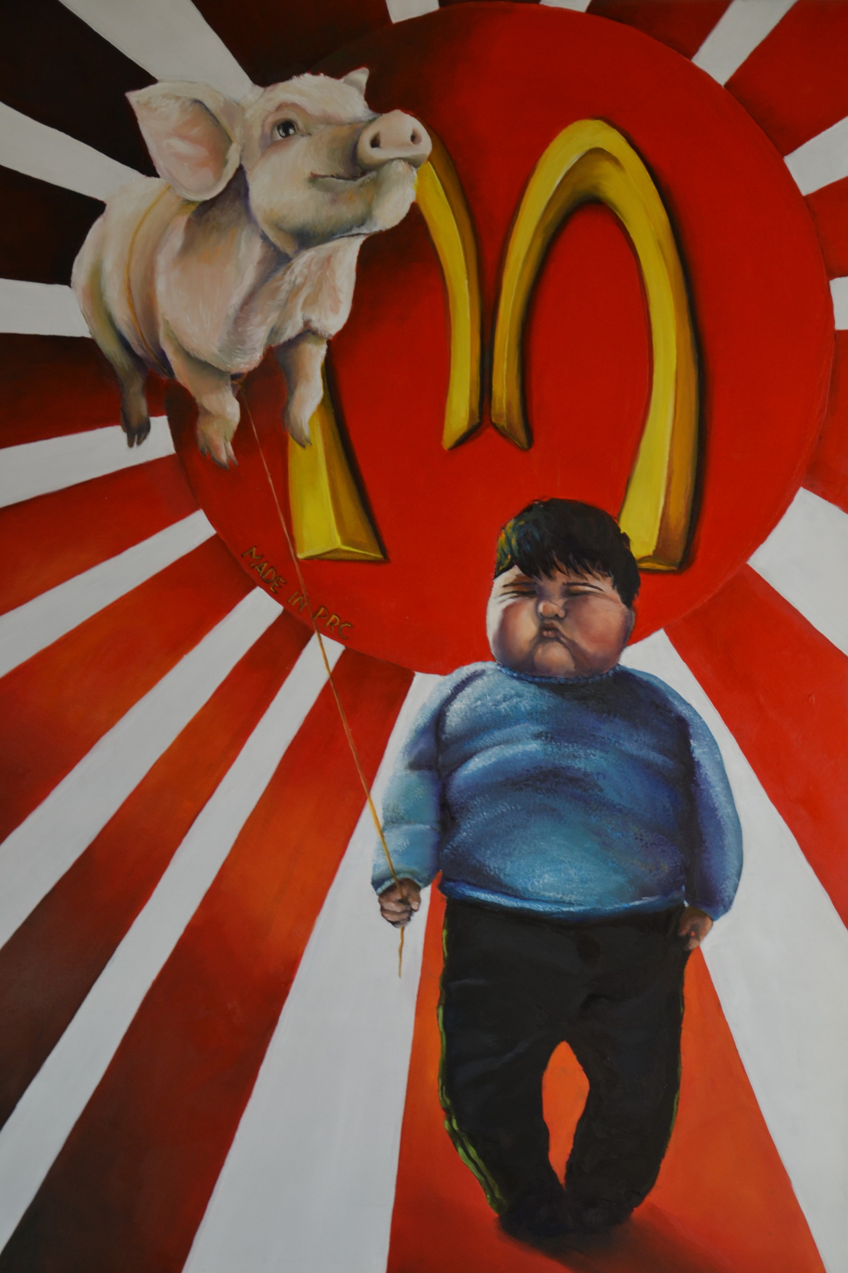 The Chinese child "victim" of our time when we are slaves of junk food, it has become fatter and heavier than the pig flying above him. The symbol of the famous chain that is behind him is fake as are distorted by many brands for the Chinese market.