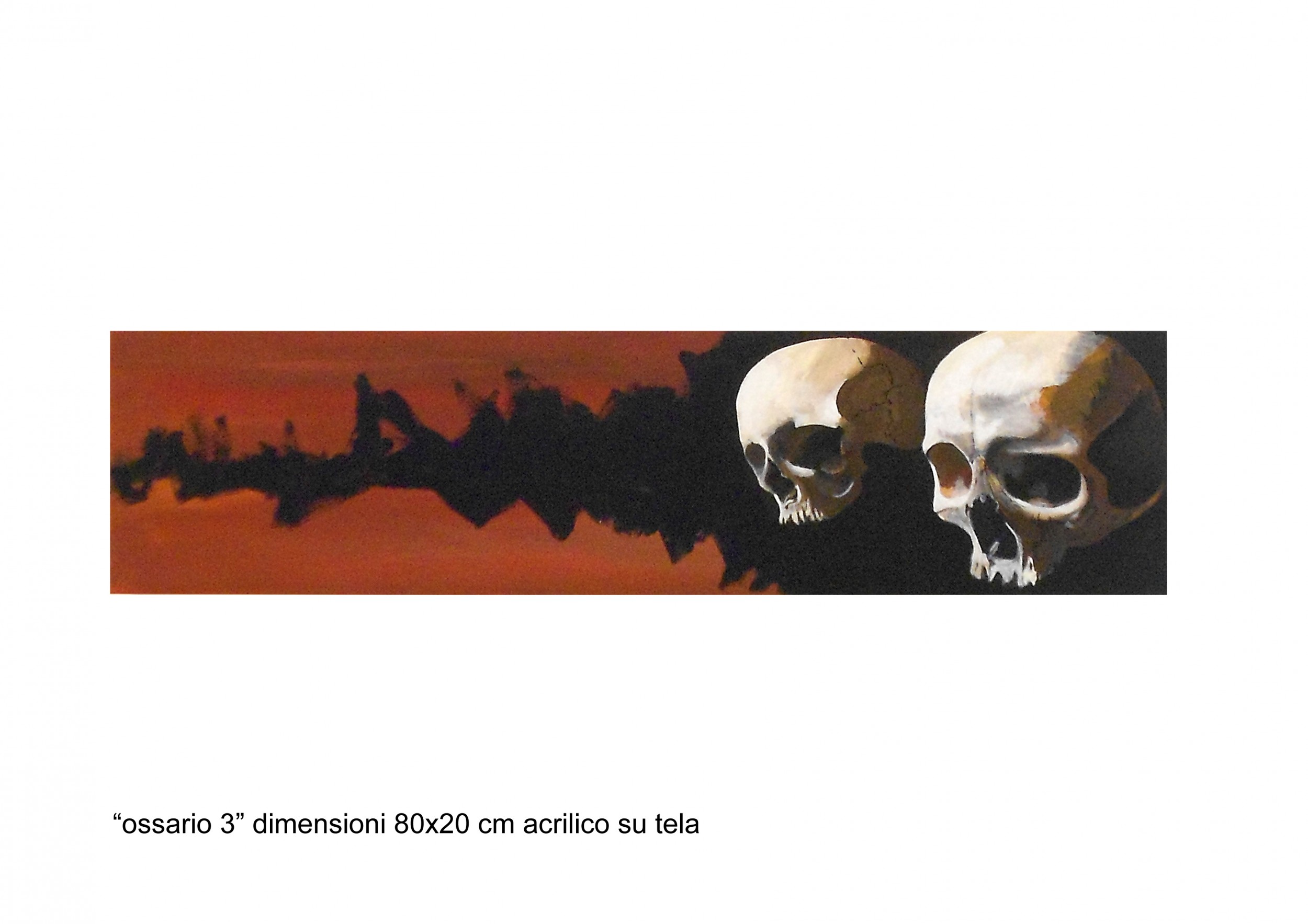 ossario 1 Painting, Death, Still life, Acrylic, 80x20cm Canvas Acrylic Orange teschio morte teschi ossario Added 12 years ago 0 I Like I don't like 0 Comments 161 Visits Share Facebook Twitter Google + There are no likes Comments 0 Say something You must login or Sign Up to write a comment Join