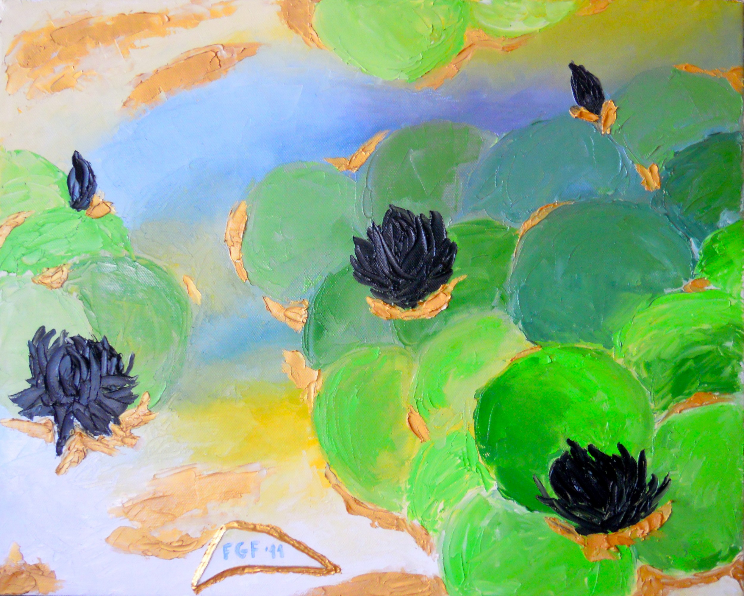 sicuramente esegui delle ninfee particolari ognuna è diversa mai uguale,solo il concetto è lo stesso coglire l'essenza del fiore,la loro collocazione in uno stagno,il perche suscitano tantissima ammirazione a chi piace dipingere la luce e i suoi riflessi,belle tutte veramente.