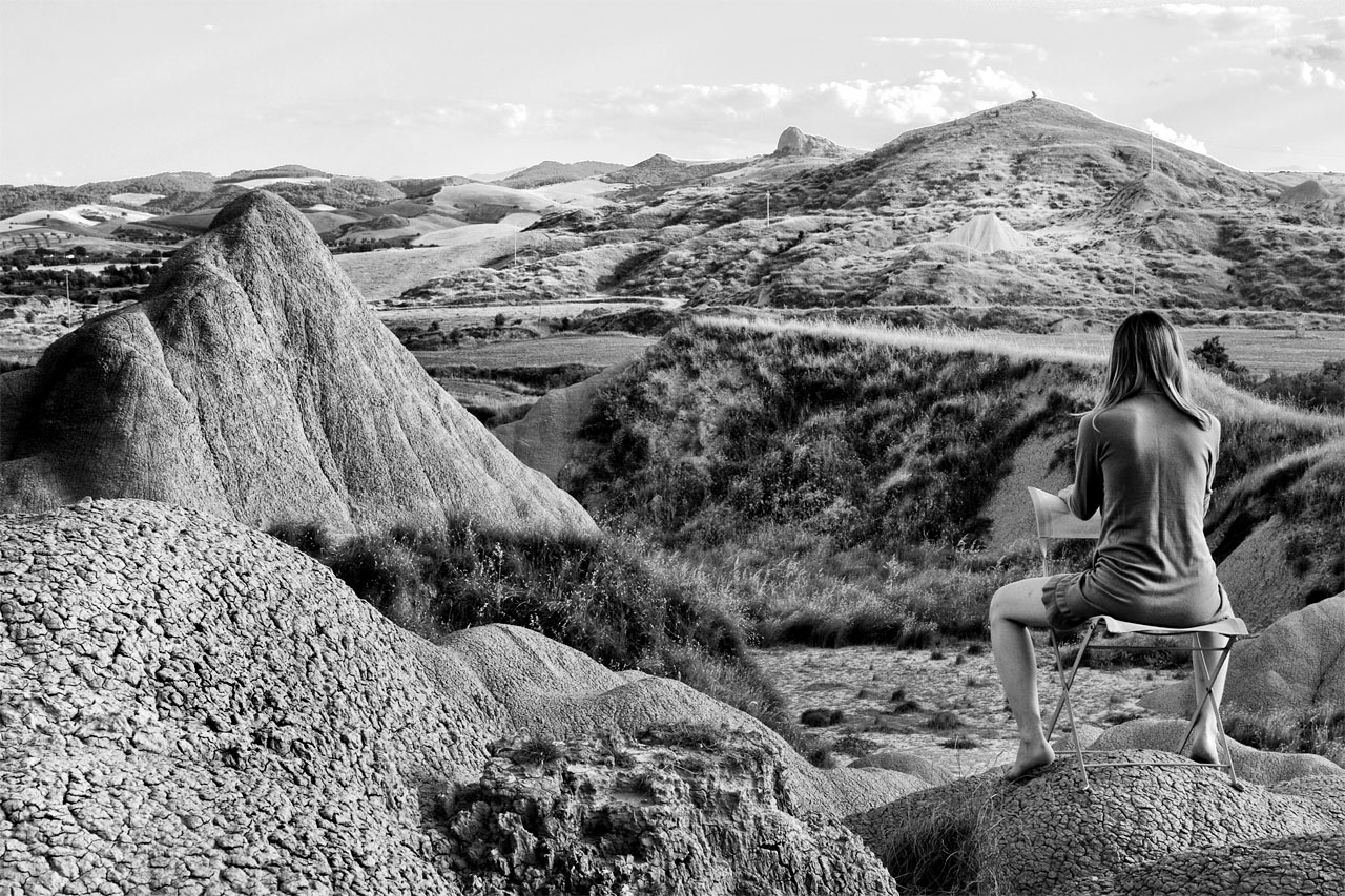 tutti i tuoi lavori sono frutto di un accurata ricerca del rapporto natura-uomo.Paesaggi di riflessione dove la figura umana entra nell'habitat e si amalgama perfettamente con la pietra con la vegetazione,minerale,linfa sangue tutto in rapporto di simbiosi.Questa in particolare è un tuo tentativo di captare il pensiero della natura fanne tesoro ed entrare nella sua stessa lungezza d'onda.