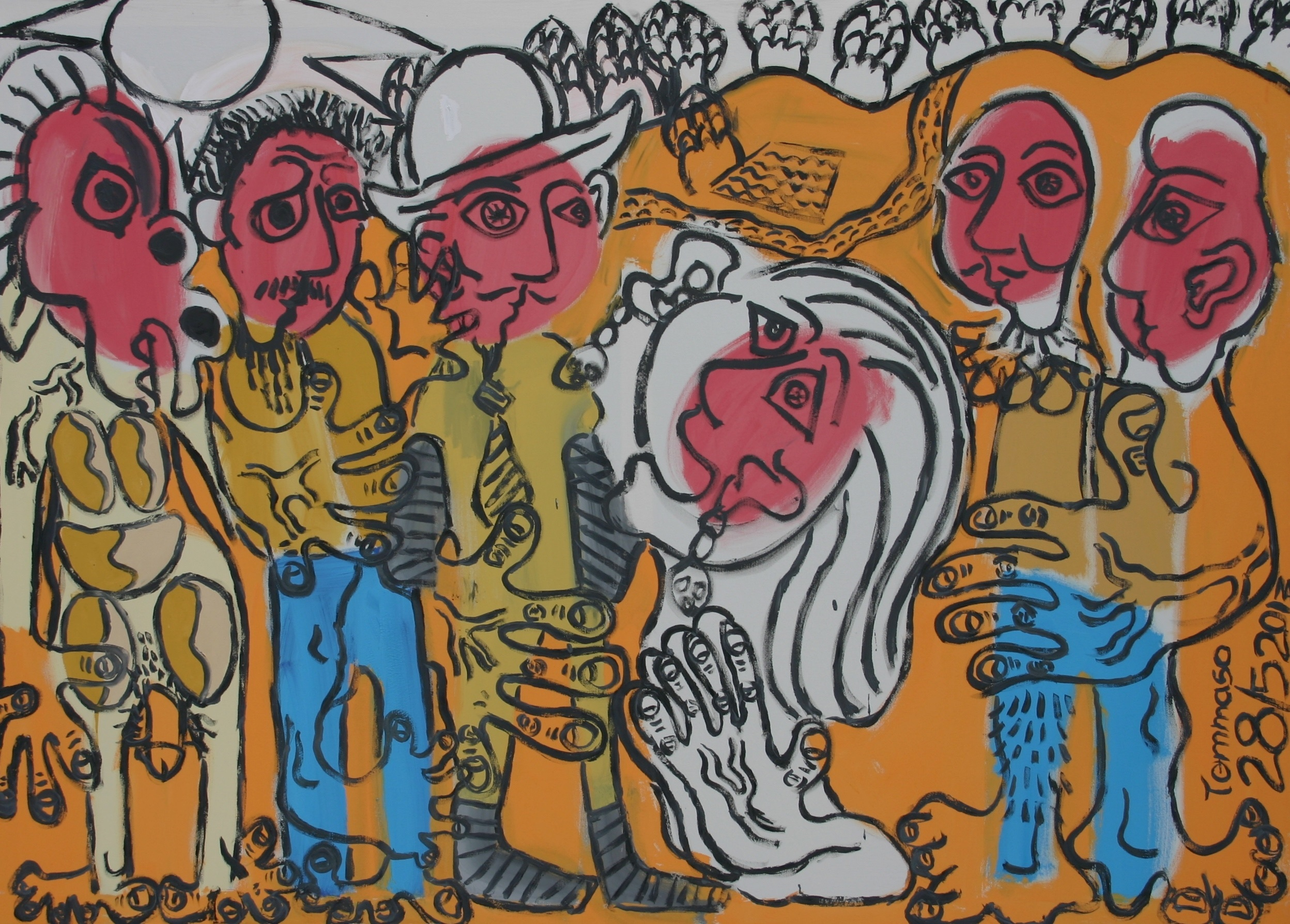 The faces, all of which are similar, are a simplification of the idea of ​​my face: I do not care a likeness to the real, but the search of my unconscious ideas. Then there are these huge hands and these feet that will surely come from my subconscious.