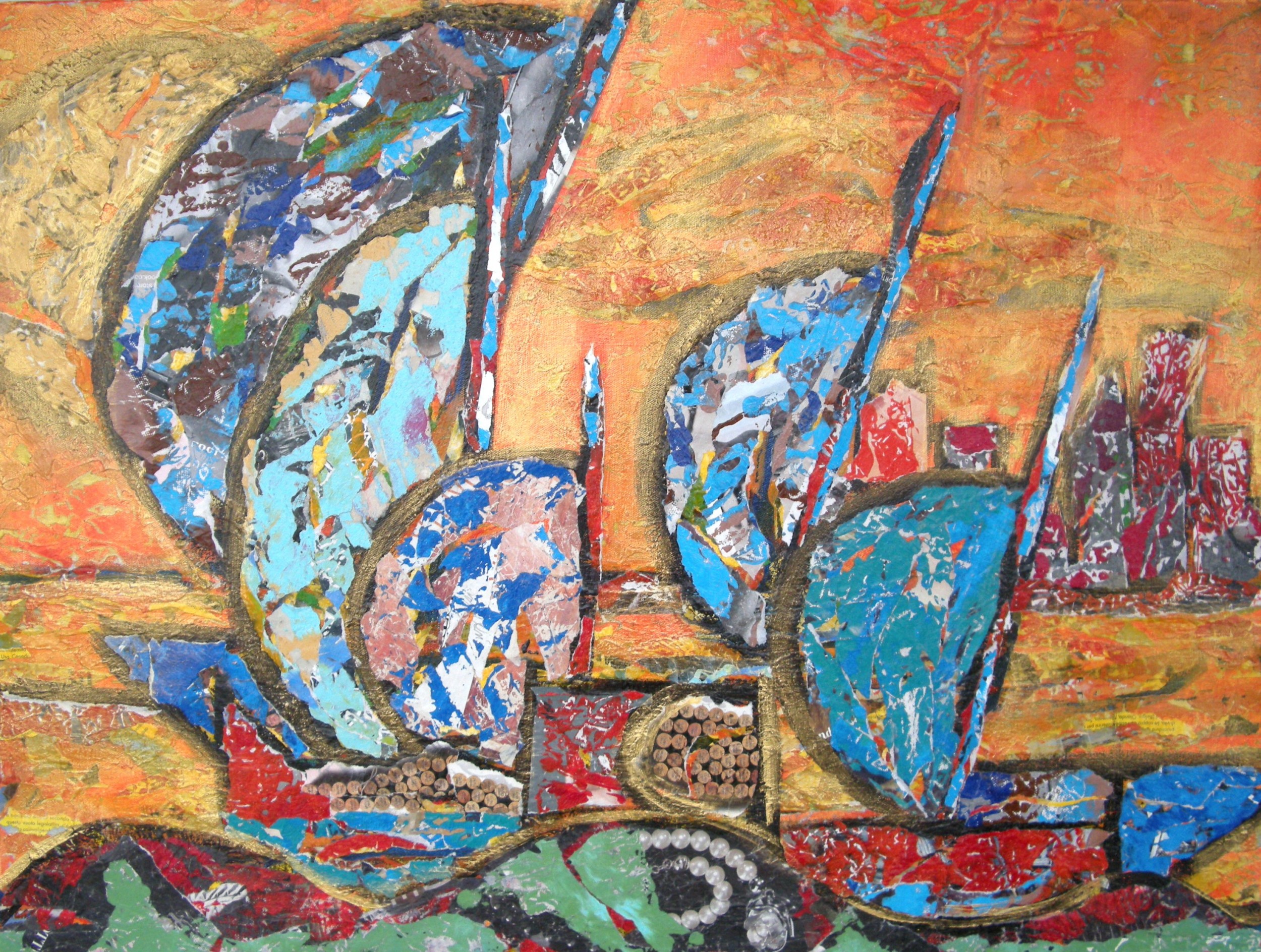 Si stagliano su uno splendido sfondo arancio quelle che sembrano barche con vele formate da frammenti di cielo : incontri di colore che stupiscono.Tutte le tonalità di colore si abbracciano con grande armonia.le perle in primo piano sottolineano perfettamente la