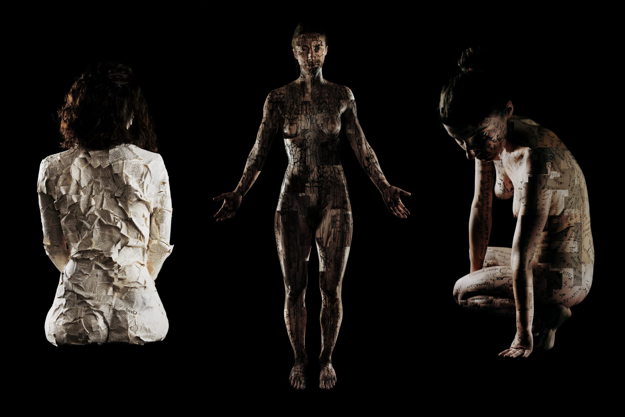 The central image is the result of the other images development: first the sitting individual, covered with superfluous information symbolized by printed paper. In the second picture the figure is rising and the unnecessary envelop is lost, but still the concepts are visible all over the individual's skin. In the third, central image, we see the figure standing, as an anatomic model, washed from the inscriptions that drip all over her, but still fragmented.