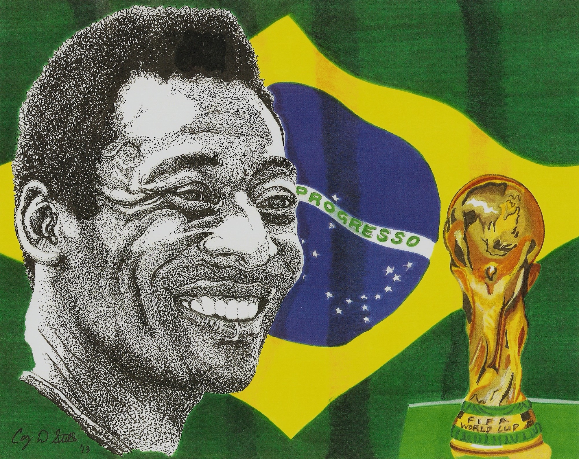 Pele Painting, Happiness, Portrait, Ink, 30.4x25.4cm Paper Ink Black/White pelè brazil soccer sports athletes world cup famous athletes This is a pen and ink rendering of Pele, the greatest soccer player ever. This was drawn in pointalism with the background done in markers. I drew this to commerate Pele and Brazil, who is hosting next year's World Cup. Added 12 years ago 0 I Like I don't like 2 Comments 200 Visits Share Facebook Twitter Google + There are no likes Comments 2 12 years ago Cory Still Artist Thank you very much. 12 years ago Maria Elena Ritorto Artist Splendida opera,complimenti! Say something You must login or Sign Up to write a comment Join