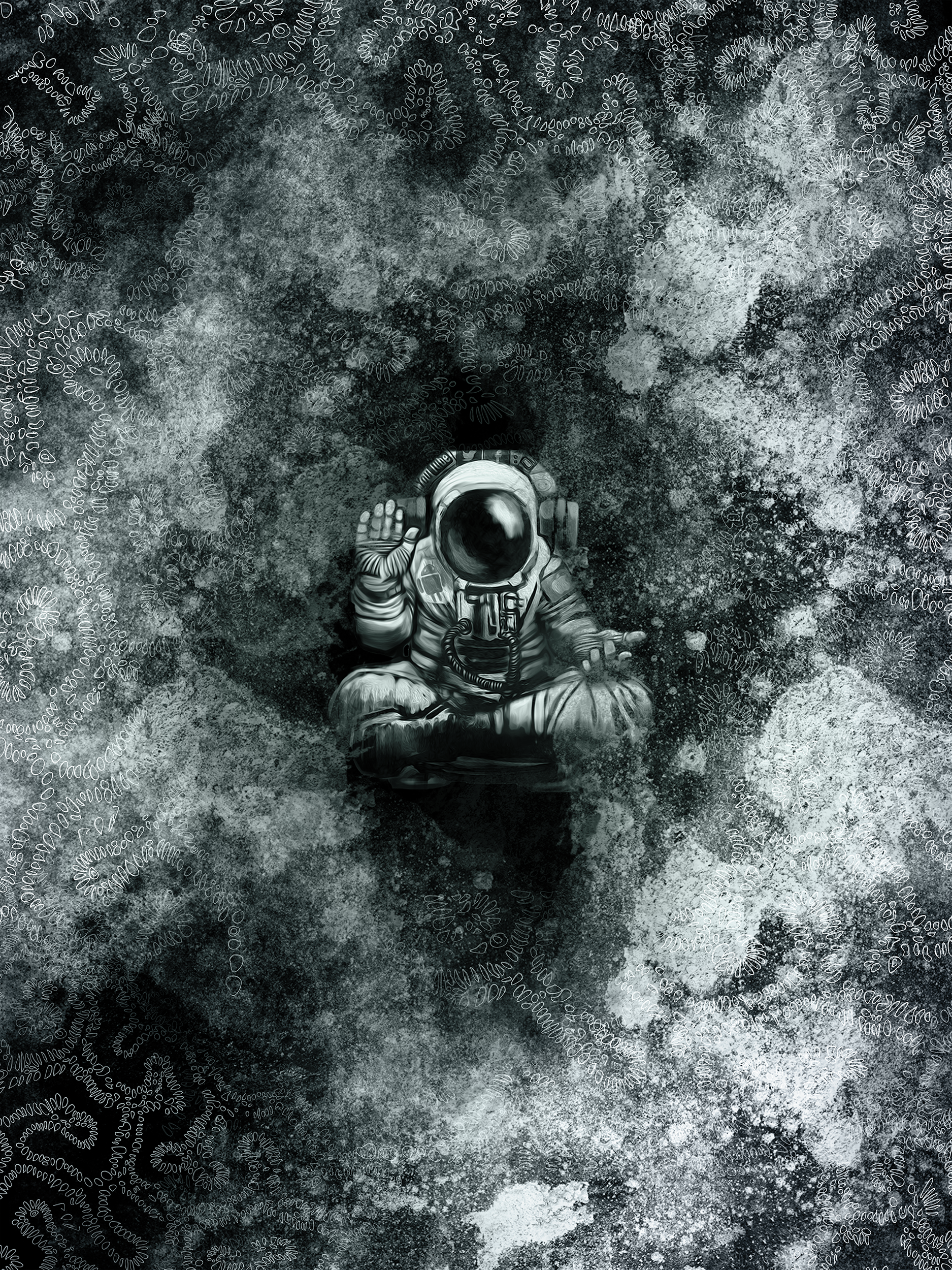 The Astronauts in this series practice mudras (sacred hand gestures). Each has individual meaning, but generally express our attempts and limited success at connecting with something bigger than ourselves.