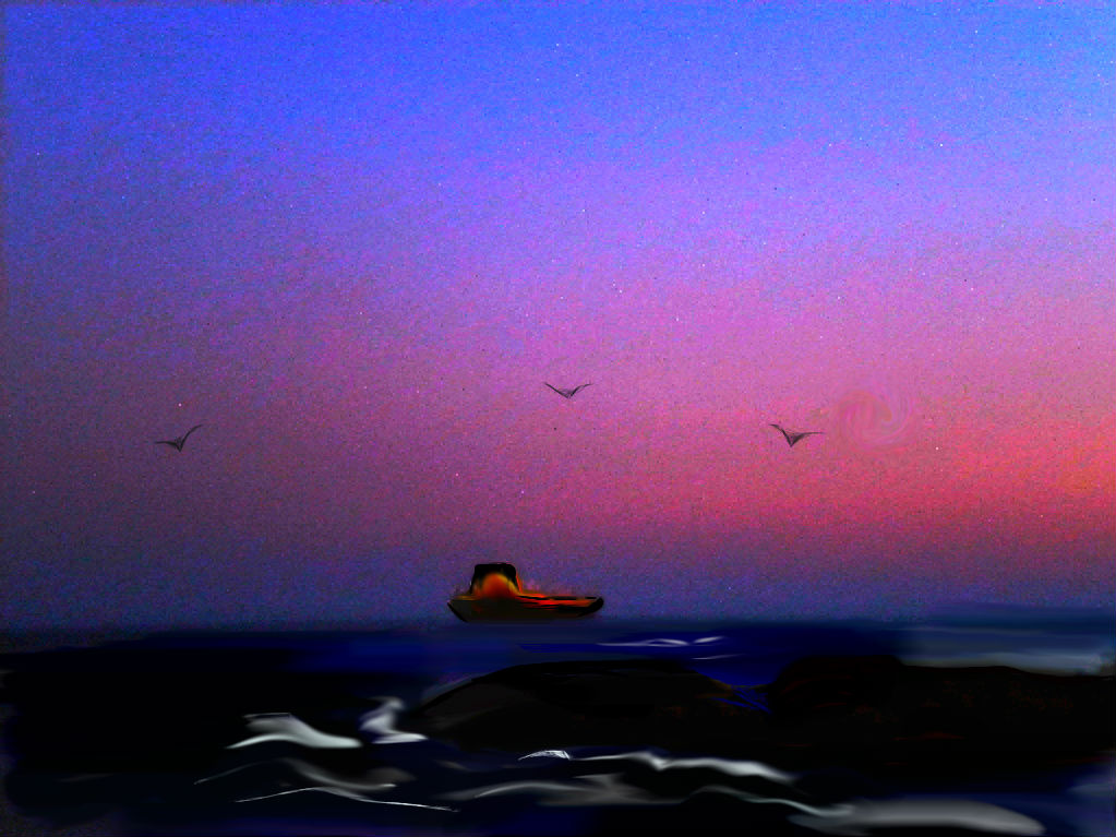 il tuo destino lo aspetti al tramonto,forse non sei convinta che qualcosa di notevole potrebbe arrivare,anche perchè senti un grande bisogno di evadere da una solitudine che palesemente esponi,non vedi un mare gioioso,di giorno con un orizzonte infinito,il tuo e delemitato da una nera scogliera,un breve tratto e arriva subito il cielo che si abbassa nella notte e i gabbiani effettuano l'ultimo giro di perlustrazione prima del riposo.Non solo i bambini disegnano sempre con i simboli anche noi adulti,complimenti