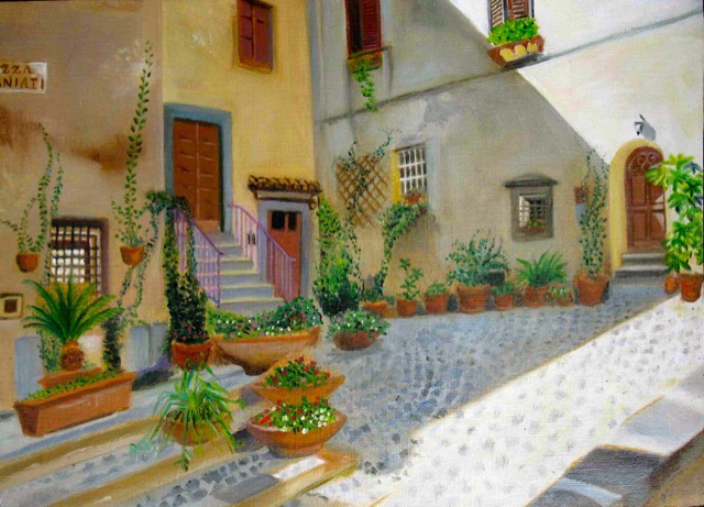 This painting is one of my oil sketches painted during my travels in Italy. It features Piazza Saminiati, located in the mediaeval town of Anguillara, which is nestled on a small cape along Lake Bracciano.