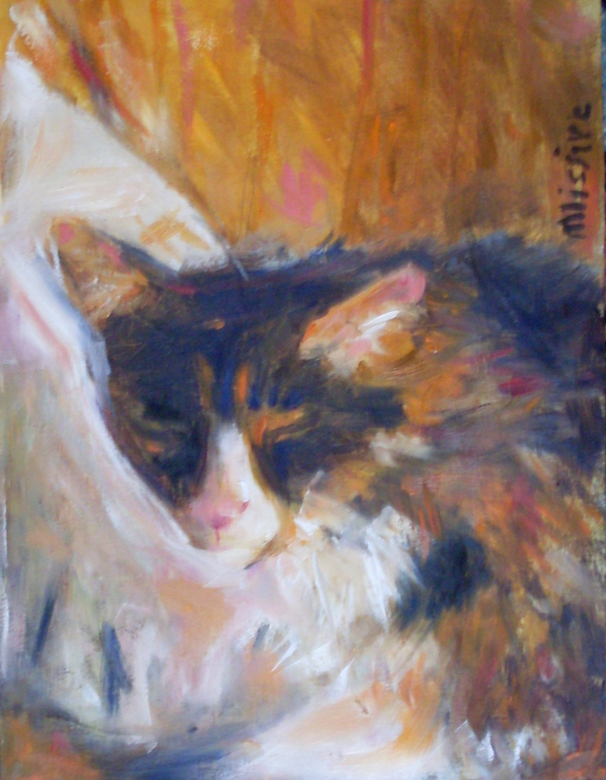bravissima sei riuscita a catturare l'aspetto dolce e tranquillo di questo gattino che beatamente riposa sul suo cuscino .. mi piace molto la scelta del colore dello sfondo che rende questo tuo capolavoro davvero speciale .. complimenti sinceri la tua amica Tanya