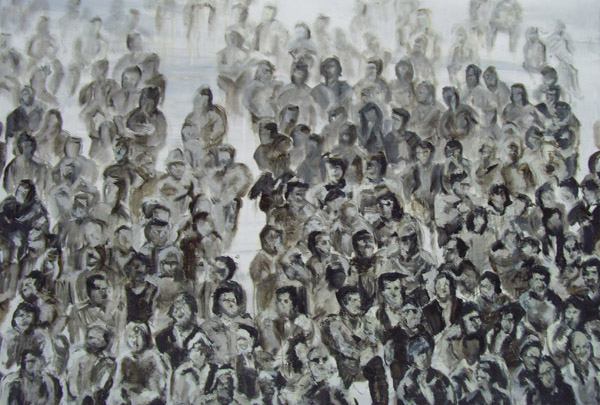 I investigate how the feeling of the collective can be felt by the viewer. The spectators are looking at you. I reverse the traditional way of looking at art: the viewer becomes the subject of the scene.