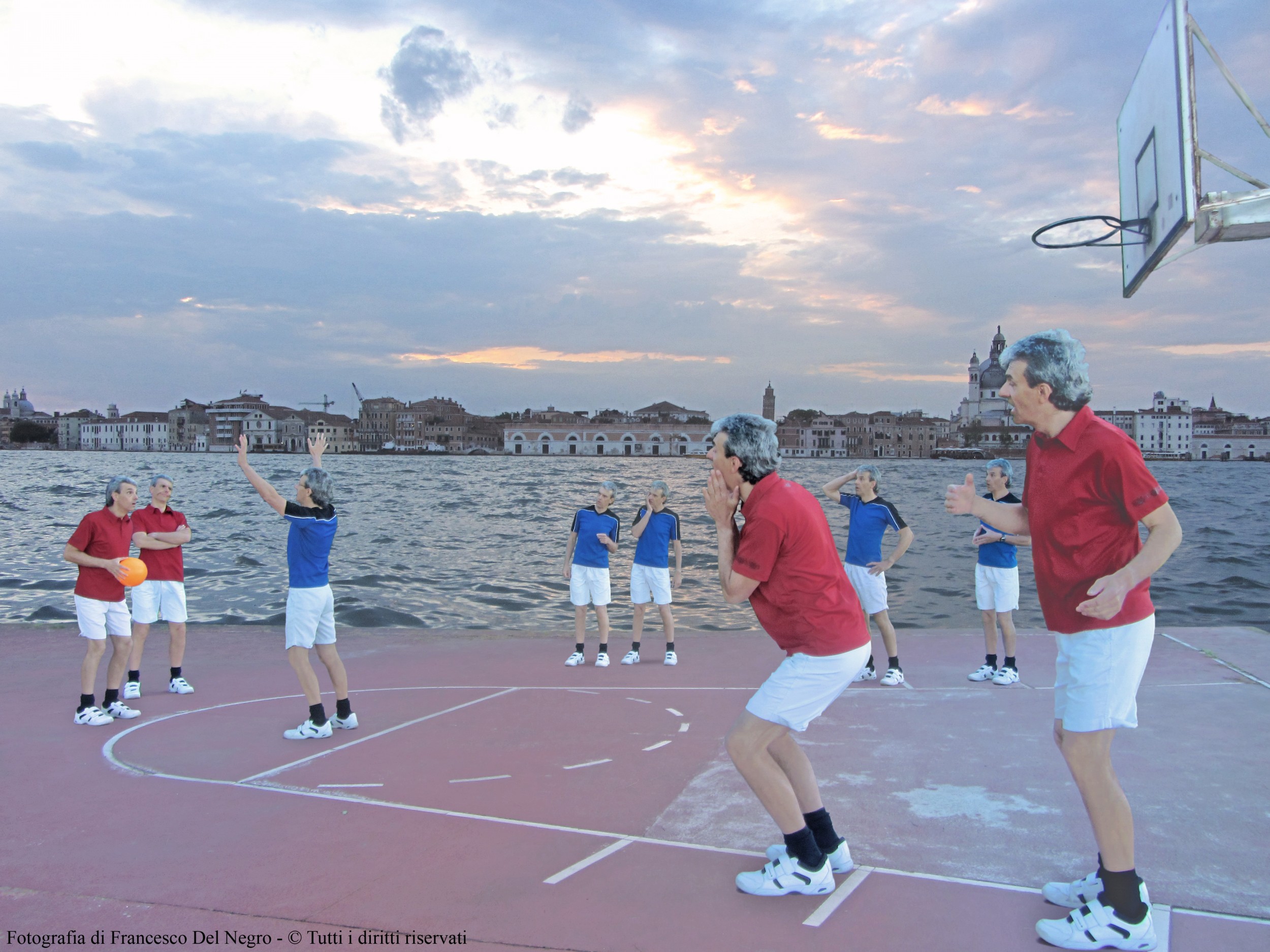 The need of the virtual background with the stormy lagoon seemed to me mandatory, due to the windy climate occurred in the morning I took the photographs for the photomontage. This is easily detected by observing the tousled hair and the t-shirts moved by the wind.