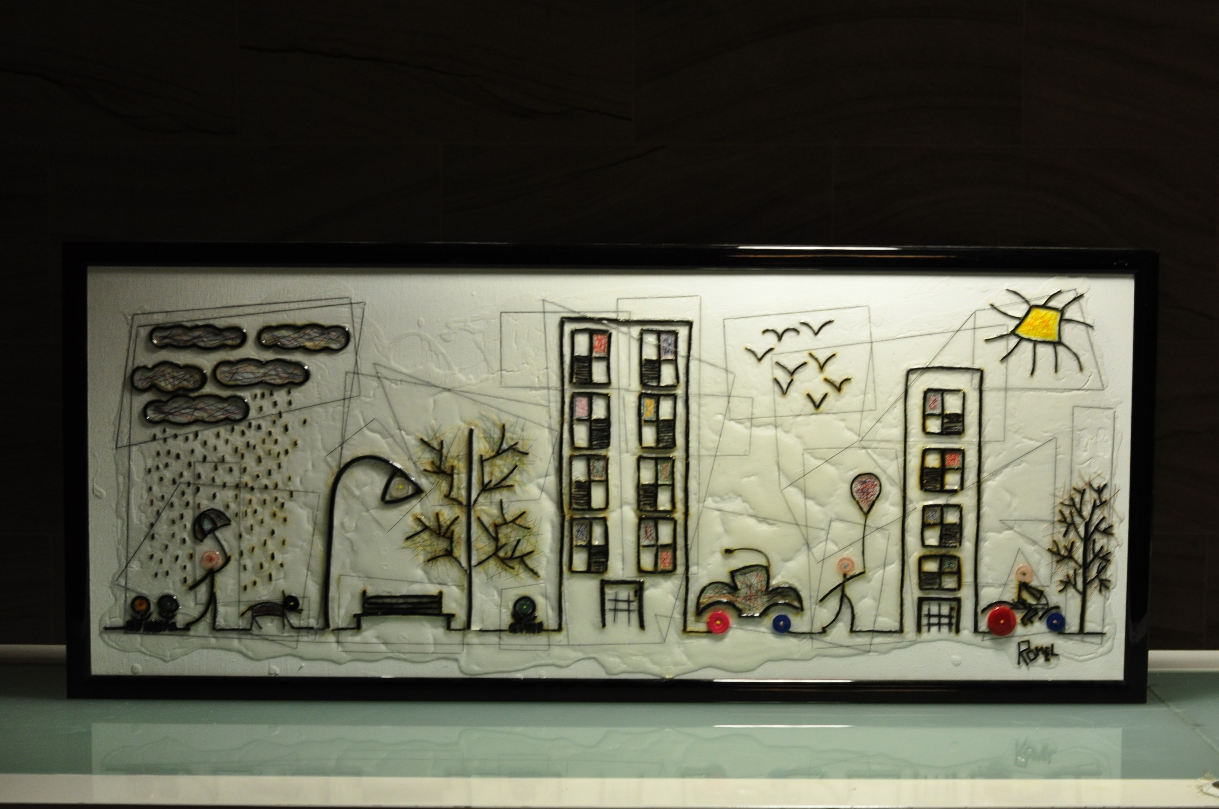 The work portrays the charming town of Rimini, in everyday's life and in its simplicity', created in key Naif, through the use of Leather, Buttons, Cotton, Acrylic, ... Flatting applied on canvas, then framed on black frame glossy.