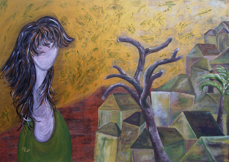 Certamente tra una delle tue più belle,si vede tutta la costruzione del pensiero,grande accostamento quasi conflittuale di stili,di concetti basilari dell'arte moderna.Tutto è fluente,meno l'albero che è spoglio ma non secco,una potatura dei pensieri e allo stesso tempo una limitazione alla libertà,il motivo non importa ma il concetto è importante.Un titolo sarebbe importantissimo,provo a dargliene uno io" Opposta al vento dell'indifferenza crudele,osservo le mie origini che sanno di convinzioni assurde.Complimenti Cinzia hai scalato la montagna