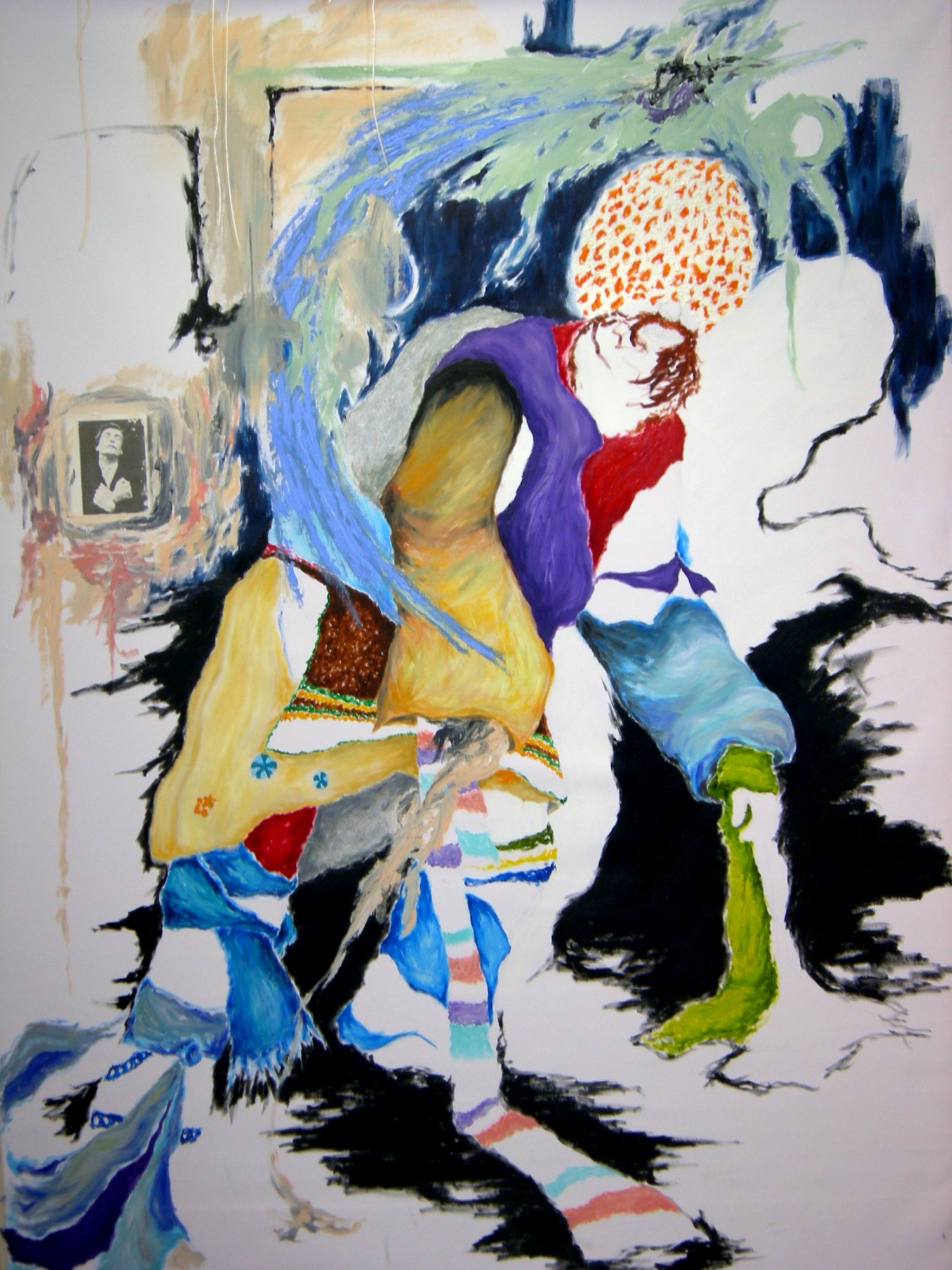 The painting "Untitled" from 2008 is based on a still image from one of my films ("I like my Music soothing", 2008), which was based on a performance. It deals with the ritualistic aspects of the painting process, the act of staging an event in an empty space, and creating the atmosphere for an occult or alchemic scene to occur. It goes beyond the boundaries of painting by hinting at the performative and theatrical as well as containing elements of movement and energy usually found in moving image / film work. With this painting I was particularly inspired by the theatrical work of Antonin Artaud and Bertolt Brecht, and the performance work of German artist John Bock.