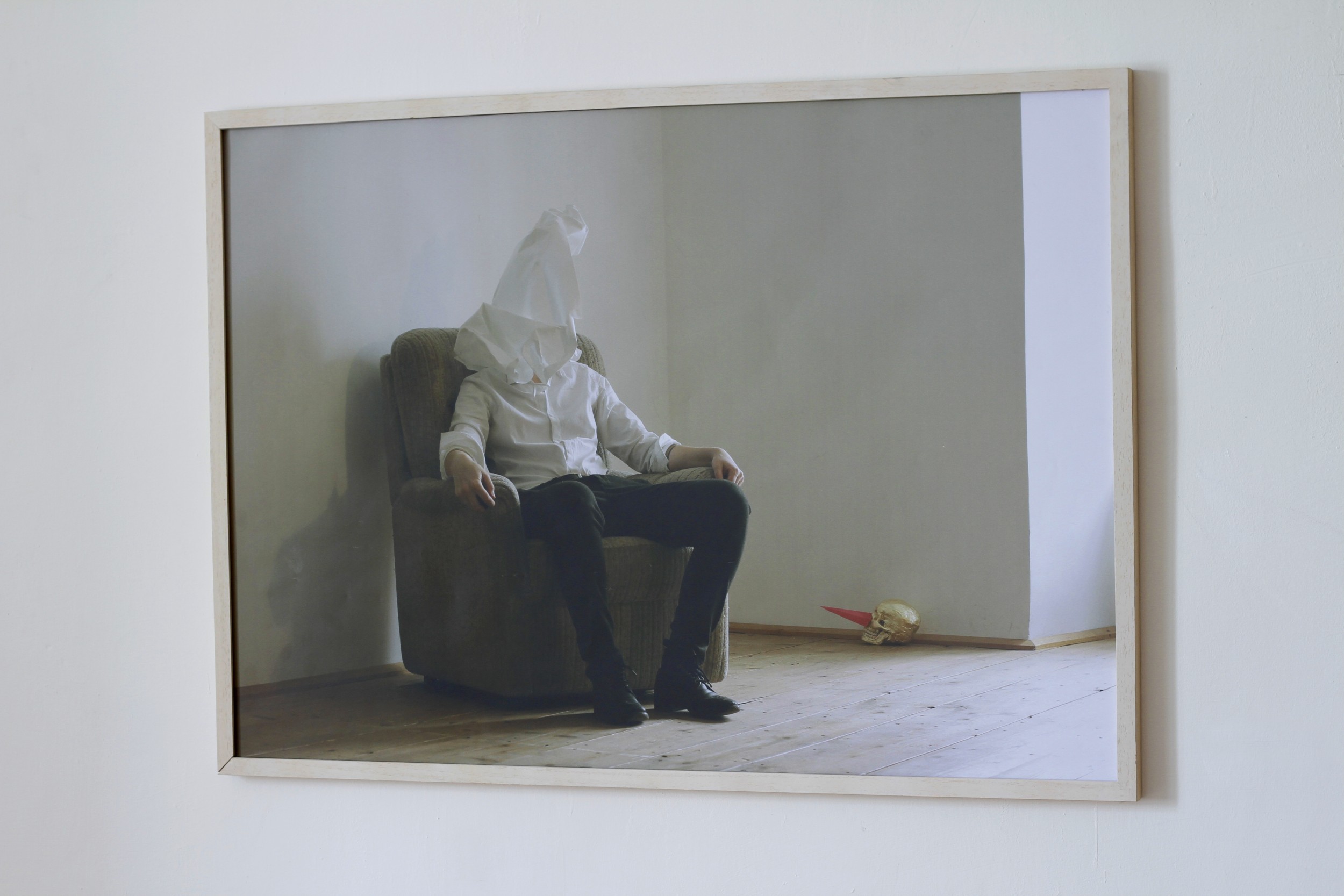 A geometrical abstract shape conceals mischievously the identity and the vitality of a body, which is constrained by a still and hieratic position, typical of the classical portraits.