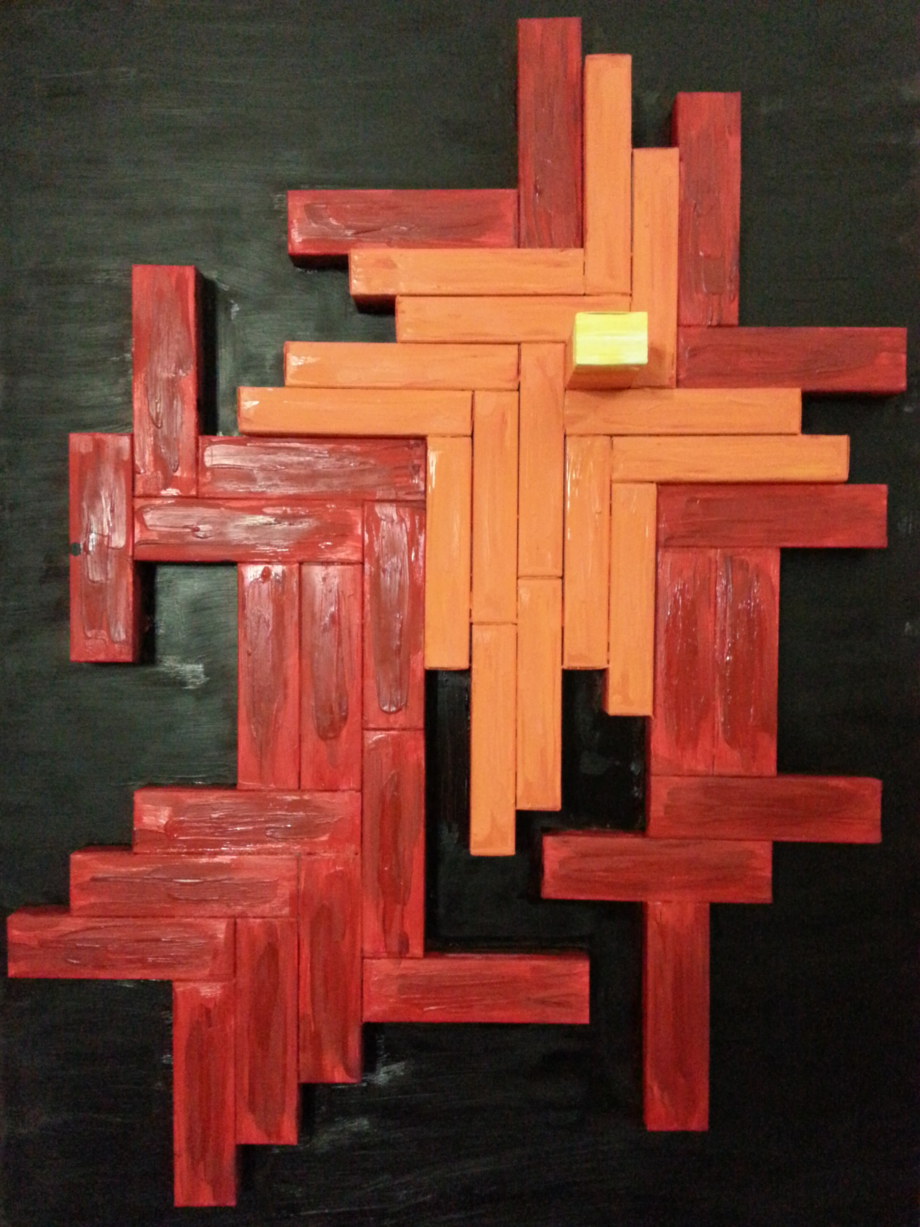To different color corresponds a different depth of the soul. The black and red are the colors of the center of the Earth and the center of the human body, represent what is warmer, more intimate, more unconscious. The orange and yellow are the light and the outside. The autobiographical element is in defining the area occupied by different colors according to the relationship and openness to others.