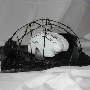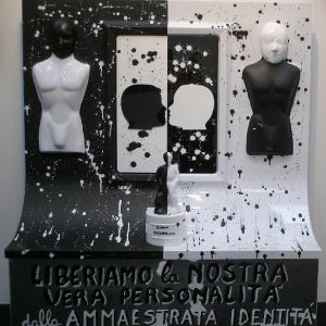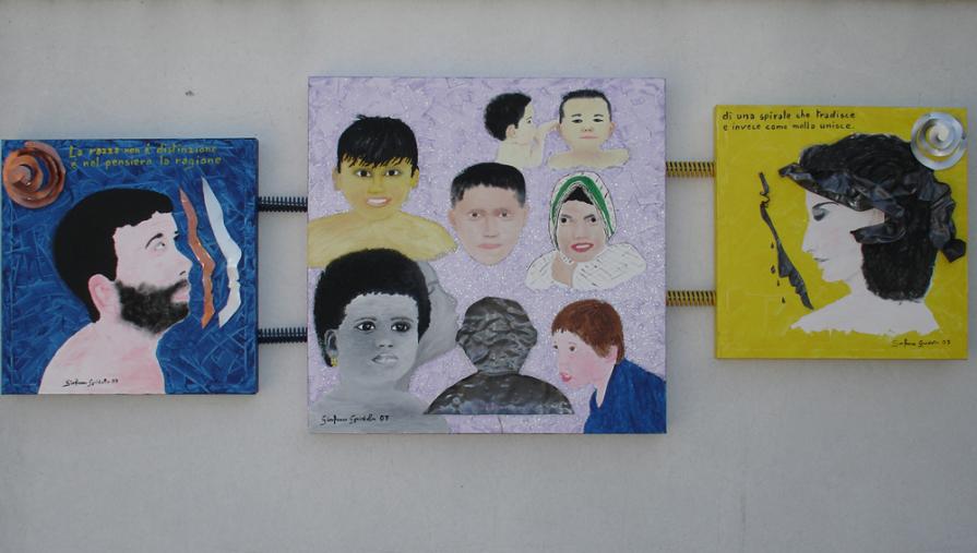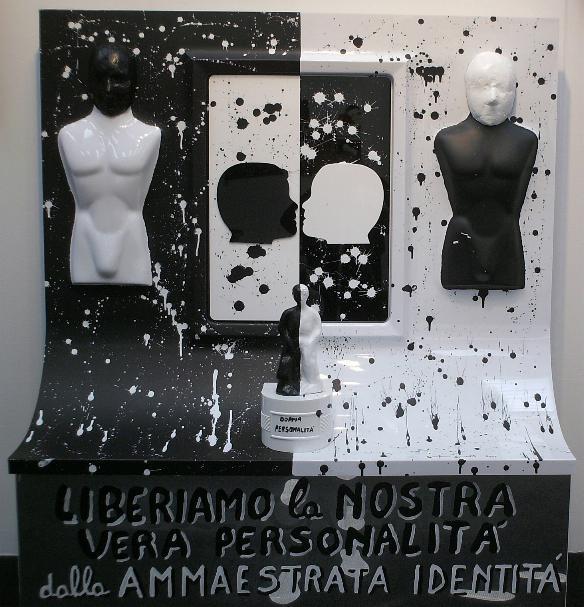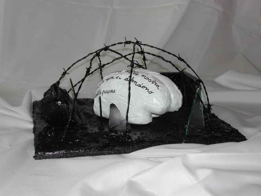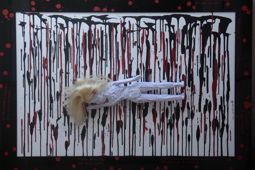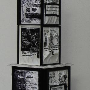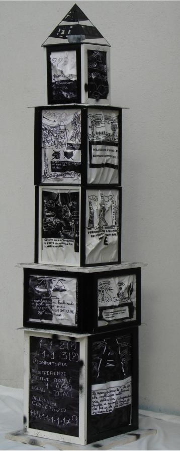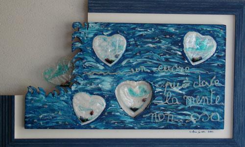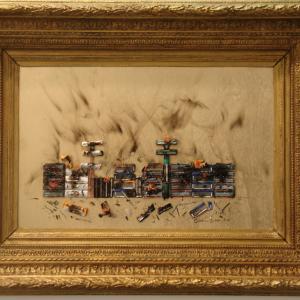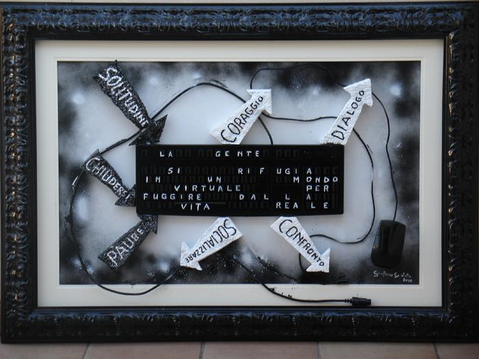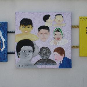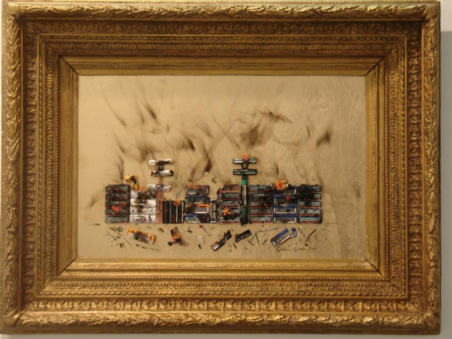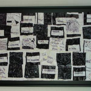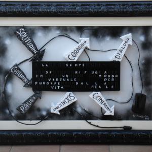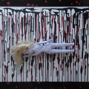 On a wooden panel covered with a silver leaf, a symbol of a world beautiful, clean, polished, a layering of color bands, starting with the black on the bottom, which is the evil, pain, death. Afterwards, shades of different colors dripping down on one another, signifying the different life experiences that intertwine, intersect, they add, combine. Rows of red color of different lengths, dripping and spread through the air erratically, crossing the borders, to signify the blood, the pain, the pain that marked his life. A black line from right to left all the colored bands diametrically size and lower ends in the black, signifying death. The writing made with iron wire, hard material, durable, which can bend, but it can break, quotes a sentence to explain and reinforce the meaning of the work: HOW TO EXPERIENCE THE TIME that cross mark life.
