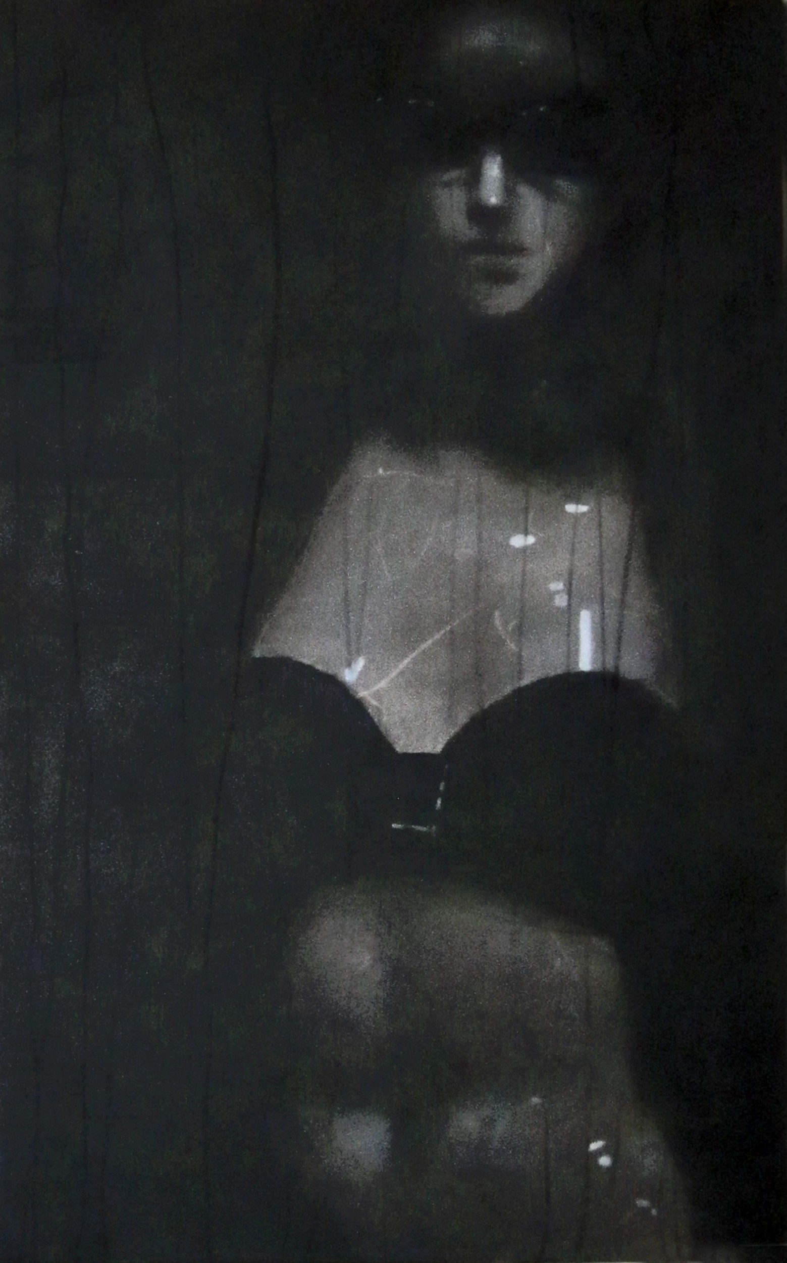 The painting belongs to the cycle of “Vanitas” of which Pagliasso G. wrote: ...The same sort of translation, although enriched by the condensation and overlapping of metaphors, is found in “Vanitas”, even though the relationship with the sublime is rendered more immediate through finitude’s disturbing unravelling.The subjects here are manikins and clothes, painted from original photographs of window shops from all over the world, the first are simulacra-metaphors, the latter metonymies of the body.The atmosphere that hovers over all the paintings is characterized by a sort of scenic rarefaction, so much so that each painting seems to be set in a metaphysical theatre…