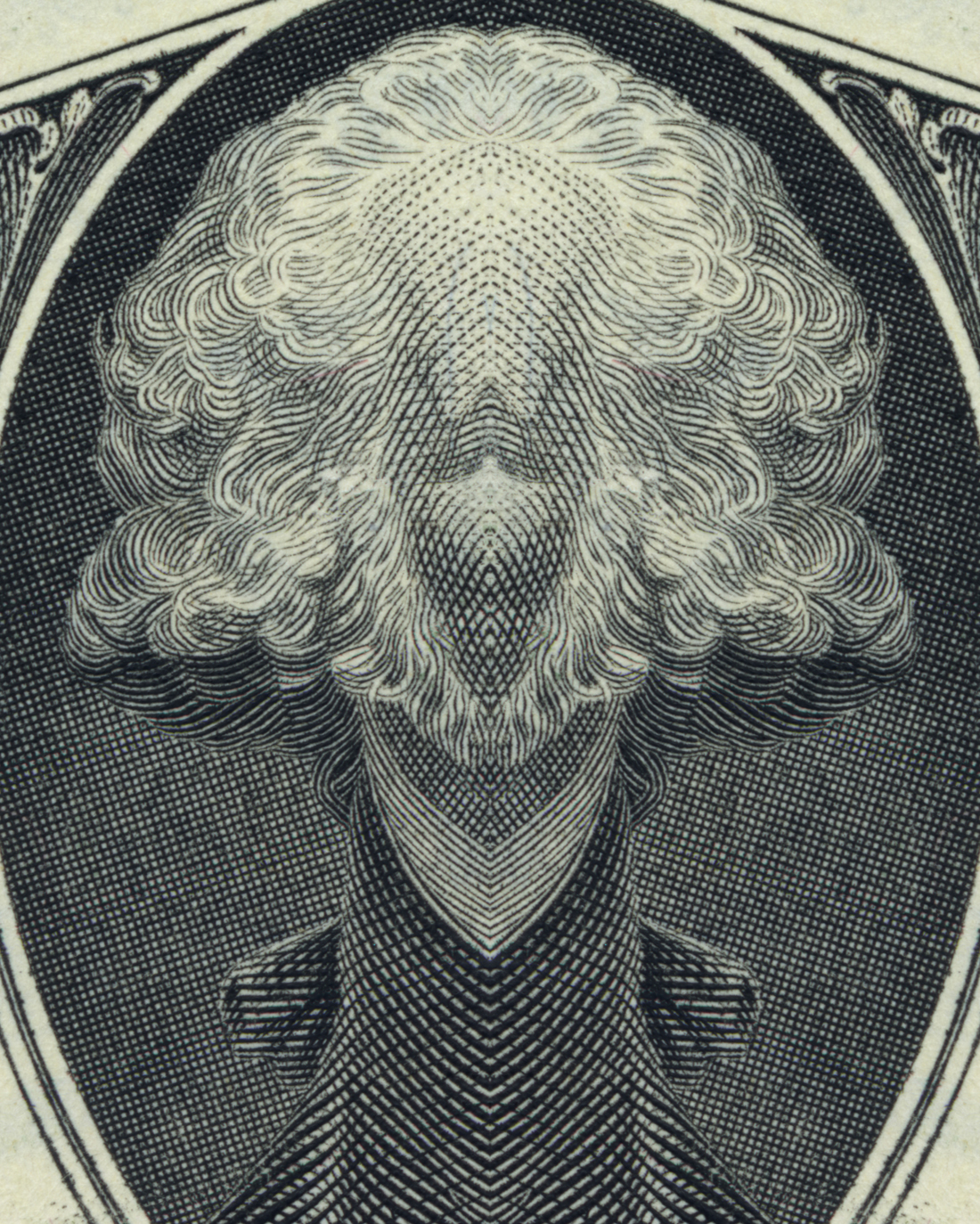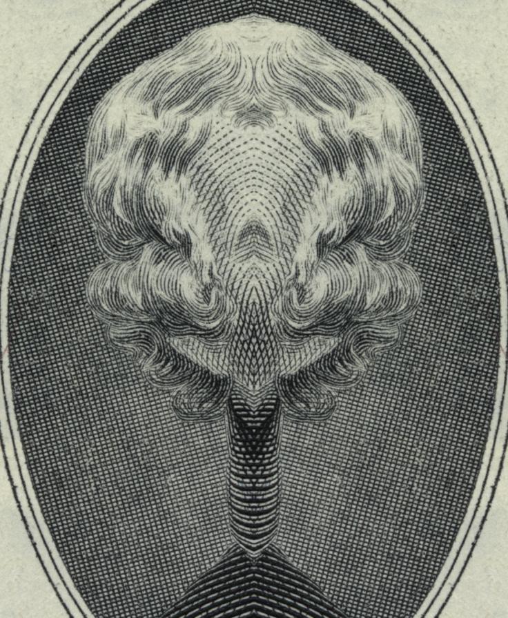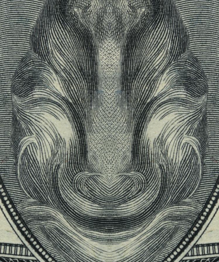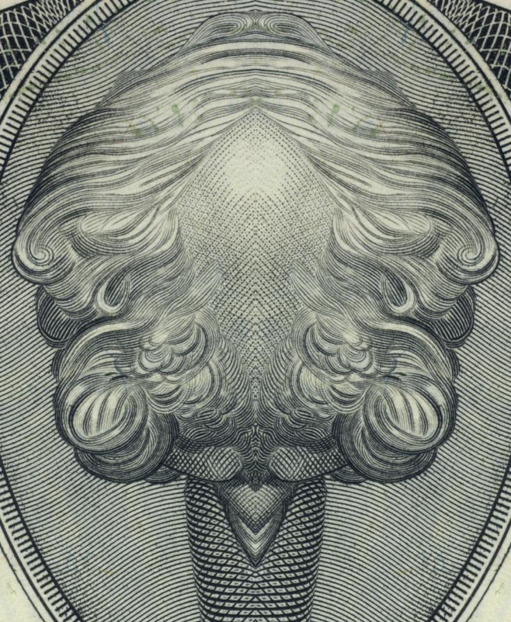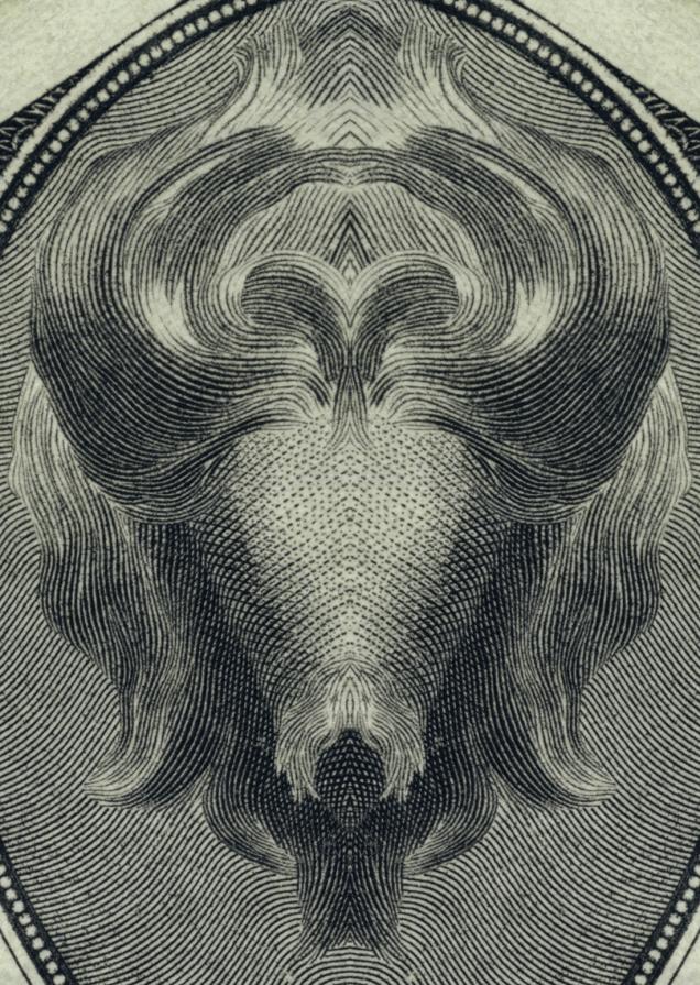 This project explores the topic ‘economic crisis’ from a different and thought-provoking perspective. The application of the concept behind the Rorschach inkblot test to the designs on dollar bills gives reason to think about capitalism in a creative manner. Combined with their mirror reflection, the forms on the banknotes reveal ironic and unexpected images showing female genitals, grinning devils, oriental-looking idols, apes and nuclear mushroom clouds.