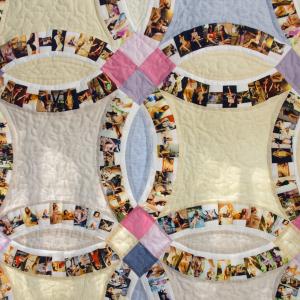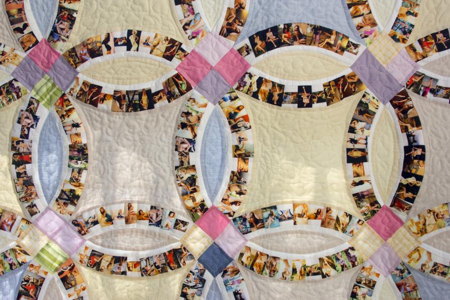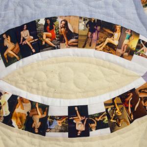 Quilt is stitched with a pattern called Double Wedding Rings. The pattern was traditionally used for a trousseau quilt made by bride’s female relatives. The used photographs were found on the matrimonial websites specially created for Russian women to find a Western husband. The images for the quilt are carefully selected from the ones which were shown on these websites as ‘the best samples’ of how women should be photographed for the best matchmaking. This work investigates the women’s role in cross-cultural marriage and fantasies the Russian women as well as Western men have about the women's’ role in it. I am interested to question the relevance of traditions and old values nowadays taking into consideration the new opportunities the globalization can offer. (Quilt, stitched from photographs printed on cotton satin. 170 x 170 cm, an unique piece.)