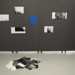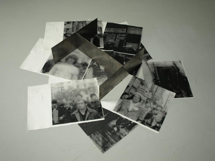 Bellow the hanged pictures, a series of images of blown up details of the protesters and the police, is scattered on the floor. A steel structure, in the shape of an H rests on top of them.
