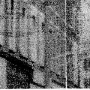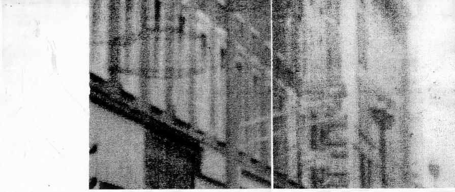 The second work, " Studies for an Irish Landscape ", is an installation of a series of six blown up images of details from the background of the three photographs I took in the protest march. These details - part of a roof, some branches from a tree, a traffic sign - have been blown up with the aid of a Xerox machine. The image is decomposed in hundreds of specks, the end result being not dissimilar to the pointillist conte-crayon drawings by Georges Seraut.