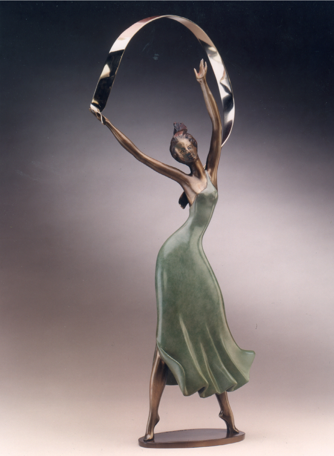 This sculpture symbolizes new hopes and aspirations. The dancer with outstretched arms uses the ribbon as a gesture of freedom. Her hair and skirt flutter in the wind, her head held high with optimism.