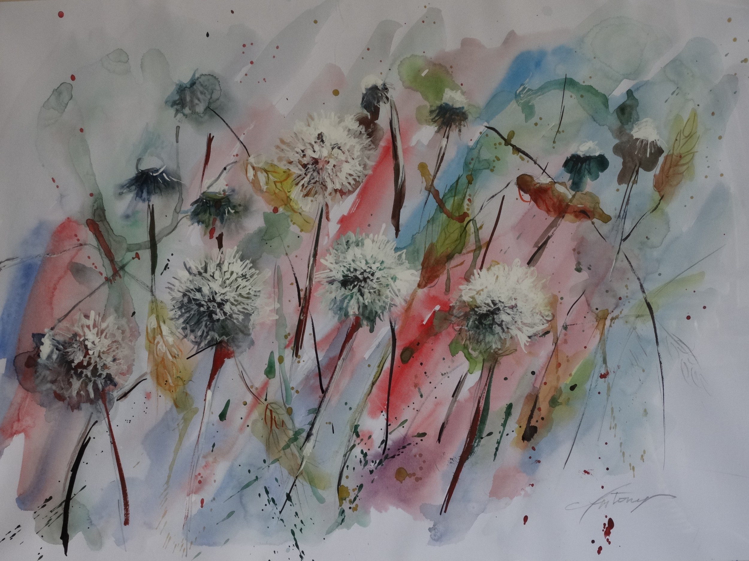 I consider art the final expression , a luggage deposit when you're too heavy , a thought that can be summed up in a simple gesture . This work is the transmutation of the memory of a sunny afternoon, a happy moment in an ' atmosphere as light as shower heads that I painted .