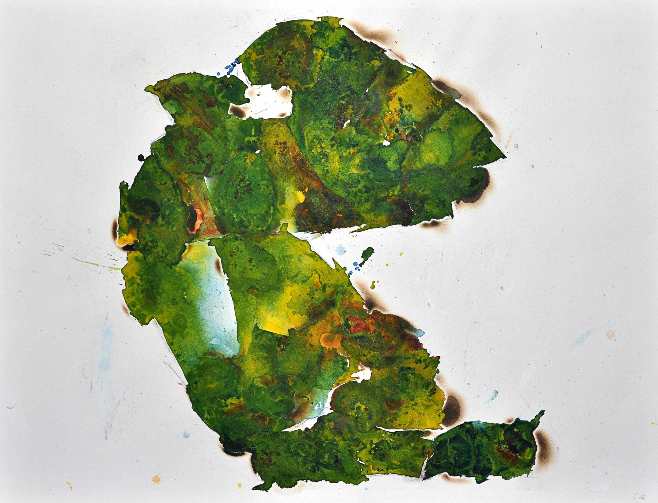 In order to create this image, to shape the world, the artist decided to bring the painting method as close as possible to the method 'nature itself' used to shape our world. He decided to replace the traditional brushes with temperature. The painting method that he developed out of this thought is an authentic and new method exclusively used by this artist. The image is a 'wet in wet watercolor’ made with fire (+-1500 °c), Further it is also worth mentioning that the painting is made out of the three basic components of color (red, yellow and blue), just like our earth that is made out of simple basic elements.