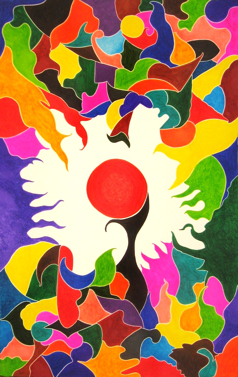 The red circle in the middle of the painting represents oneness and the passion we are searching through our life to reaching out to be as a one.