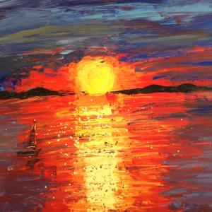 Desidero spendere alcune parole per raccontare l'emozione che riesce a generare questa opera... Si mostra istintiva e piena di vita. La forza dei colori caldi è sempre piacevole da affrontare ma pochi sanno accenderli al meglio. Tutto si muove... Libero e spensierato come quella piccola vela che avanza leggiadra e sola nell'universo mare. Adoro quella linea dell'orizzonte perduta e lontana... A volte sembra di ascoltarlo quel mare che parla e sussurra... Come il battito del cuore di una ragazza innamorata. Il sole ti stringe e avvolge nel suo turbinio sensuale e impossibile da osservare. Voglio continuare a vivere questa magia... Prima che i colori freddi della volta celeste rivendichino il loro dominio lasciando il palco alla "signora" notte.