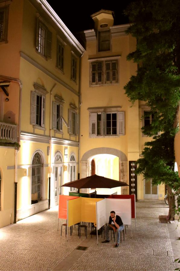Pick-up Line consists of eight small colored rooms in a grid. Every room has a phone in it. When you pick up the phone, another one of the phones rings. When someone else picks up that phone, you can talk to eachother. If you hang up the phone and pick it up again, another phone starts ringing.
