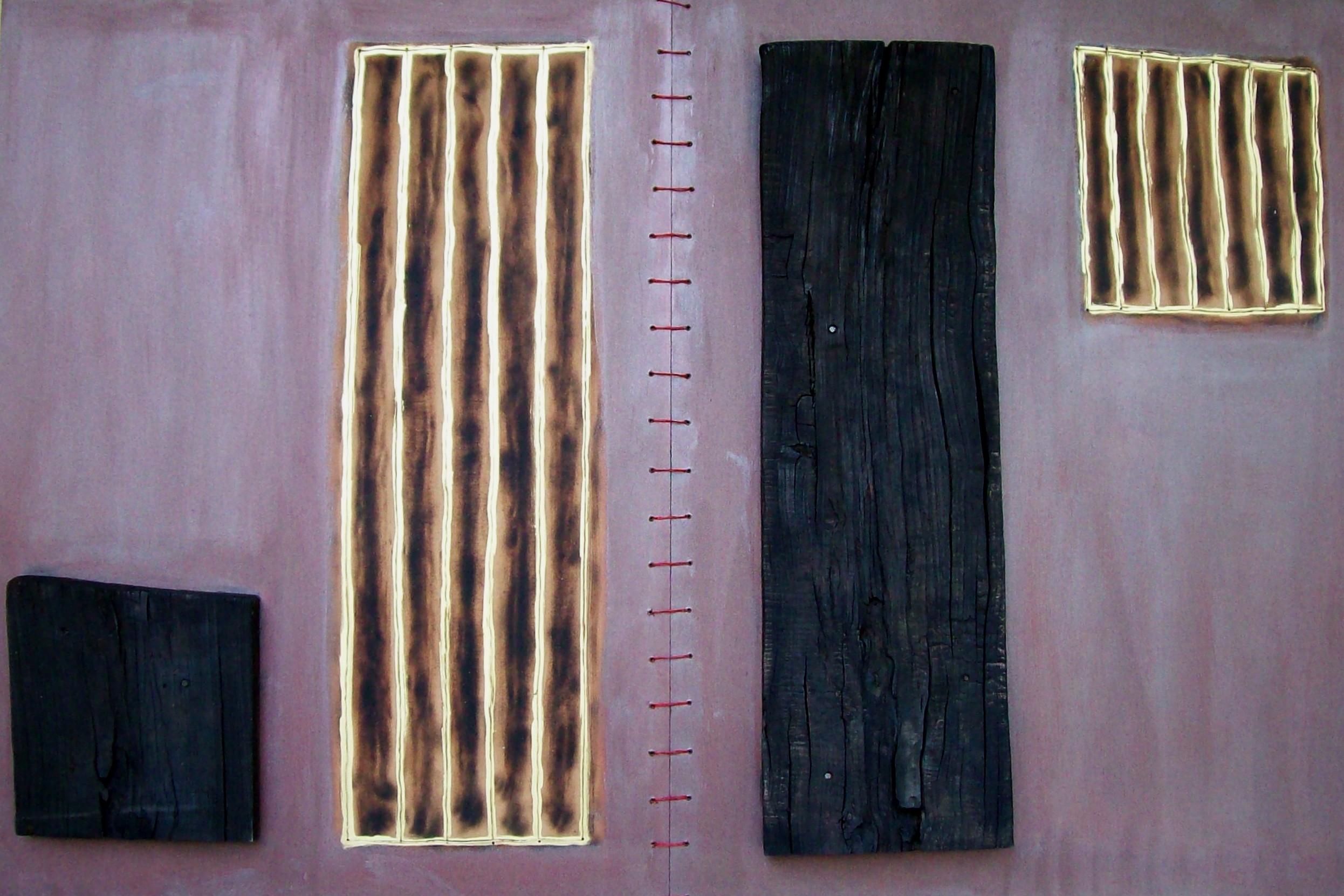 The work (a Diptych), here re- presented, belongs to a rash of researches titled “Cyicling and Recycling” where the arstist tries to revisit and translate natural materials out of their common contest (the utilitaristc e productive one’s ), mostly joined to practical contingency, in order to give to them a new aesthetical dignity (at least, as regards the representative side). Artist’s necessity to resume the object out of his old context is coinciding with a second chance to open it to a new meanings, a material redempition that we can also read as an ideal renewal too. The picture itself plays his rule thanks to the interactions arised out of the juxtapositions of recycled objects; now, out of conventional scheme, the object can play a new life gaining in meaning and importance, Presence/Absence became otherwise a mood of the same perceptual experience of realty, lived as an appendix of ego itself (the subject). In this efforts of going out of its limits in order to embraced the external realty, subject, paradoxally, come back towards himself again. An endless process who can find its balance only in aesthetic representation