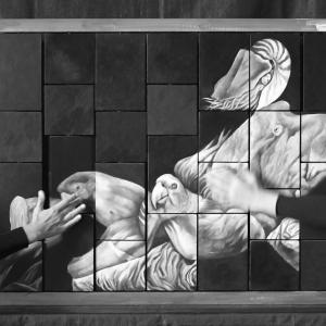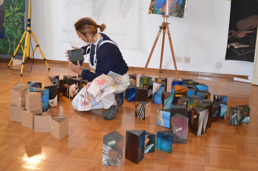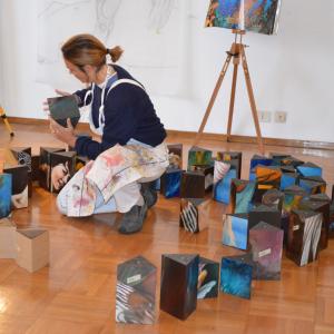 Her art expresses itself through a mobile code, that is an autograph brand but, above all, a linguistic scheme between aesthetics and content. My works are pictorial puzzles offering multiple compositions, freely constructible or deconstructible. By rotating the parallelepipeds on a grid you can compose an image or interweave different images. An interaction with the viewer, who will be able to change the sequential order and, above all, to enter the dynamic principle of the original thought, completing a work that requires manual actions, tactile contact, active imagination and orientation of visionary imagination: a mobile code that reinvents the world on the strong roots of the world itself, thus cementing the foundations of memory, thus establishing the curve of this long line of horizontal time....'