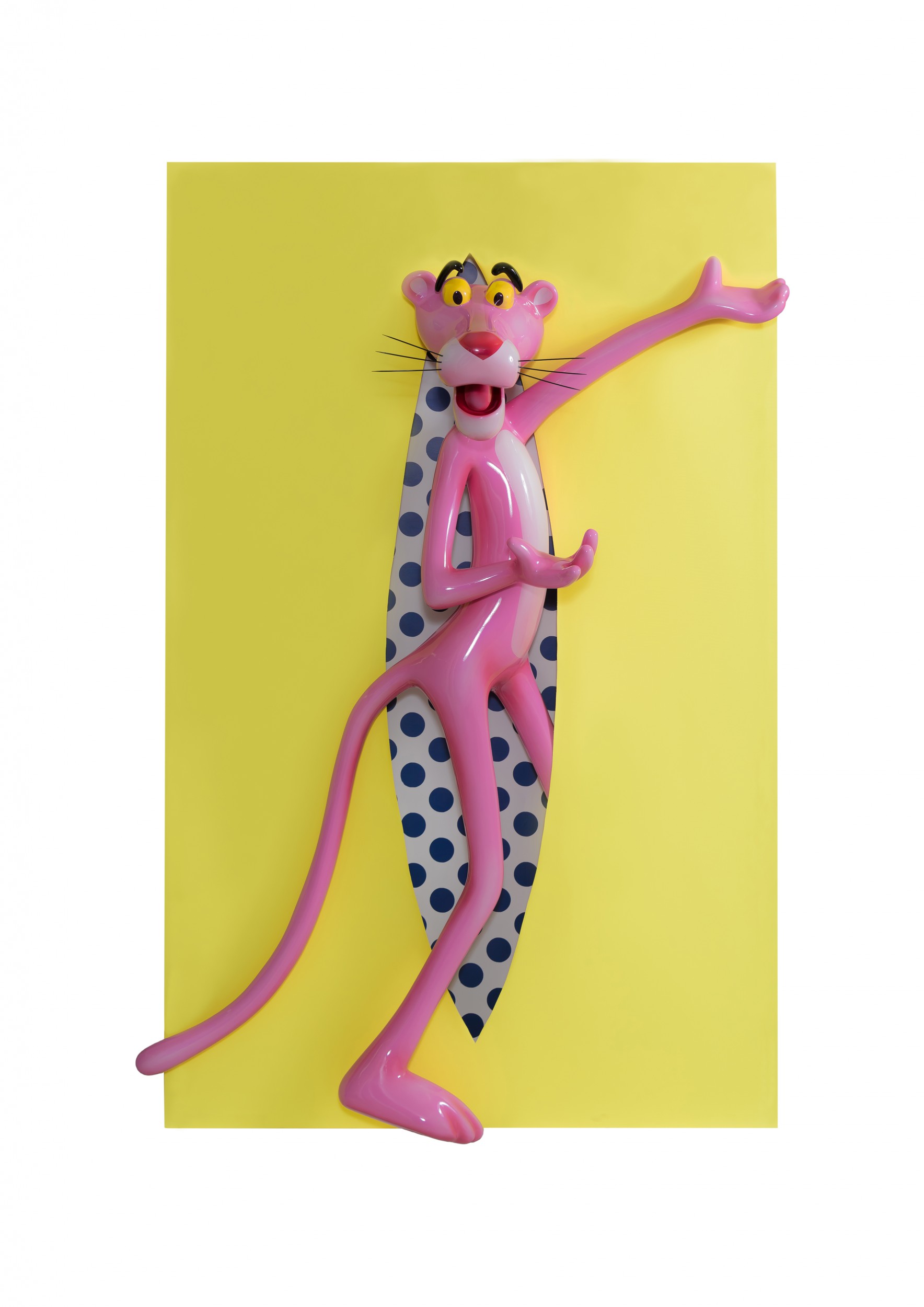 Lomaka transforms the traditional 'battle of the sexes' into a joyful play from which both parties derive pleasure. She focuses on the climax of their mutual relationship, resulting in these moments of magic. Pink Panther assumes various imaginable poses and positions around the almond-shaped hole, powerless to escape its magical attraction, revealing his dependence. Step by step, he experiments with the variety of methods to achieve the desired goal which lies beyond this reality, and is namely, hidden behind the hole. Only when being joined together and acting together, they achieve the desired catharsis, so evident in the joyful emotions of Panther, manifest as stars and circles inhabiting the space inside the cut. Only then, as the artist believes, will the 'pink magic' happen.